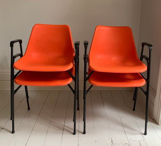 4 x Rare Vintage Robin Day, for Hille Orange Stacking Chairs w/ Arms