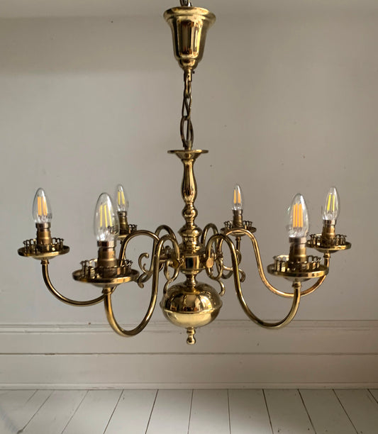 Vintage Flemish Style 6 Arm Brass Plated Chandelier with Scrolling Flourishes