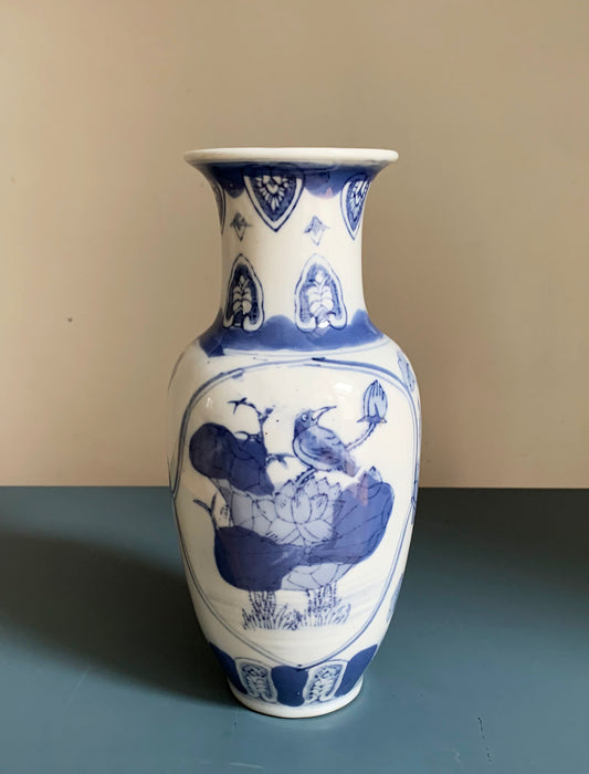 Vintage Chinoiserie Blue & White Porcelain Vase with Bird & Floral Details, VGC