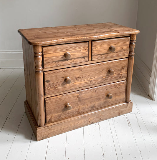 Vintage Pine Chest Of Drawers, 2 Over 2, Curved Top & Decorative Side Columns