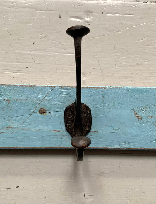 Vintage Wall Mounted Blue/Black Metal Coat Hooks x 4 on Wooden Painted Board
