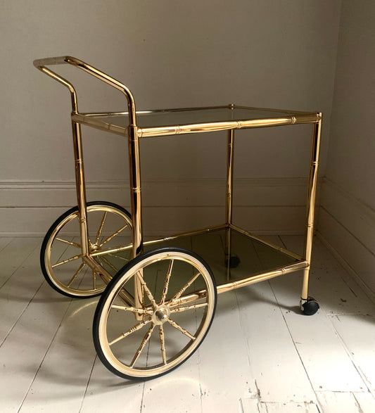 Vintage 1970s Faux Bamboo Brass & Glass Drinks Trolley / Bar Cart