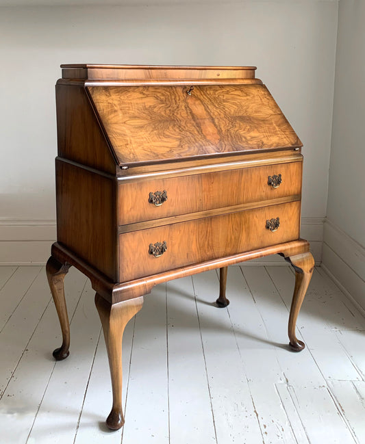 Vintage Walnut Burr Veneer Two Drawer Bureau With Queen Anne Legs & Secret Lid