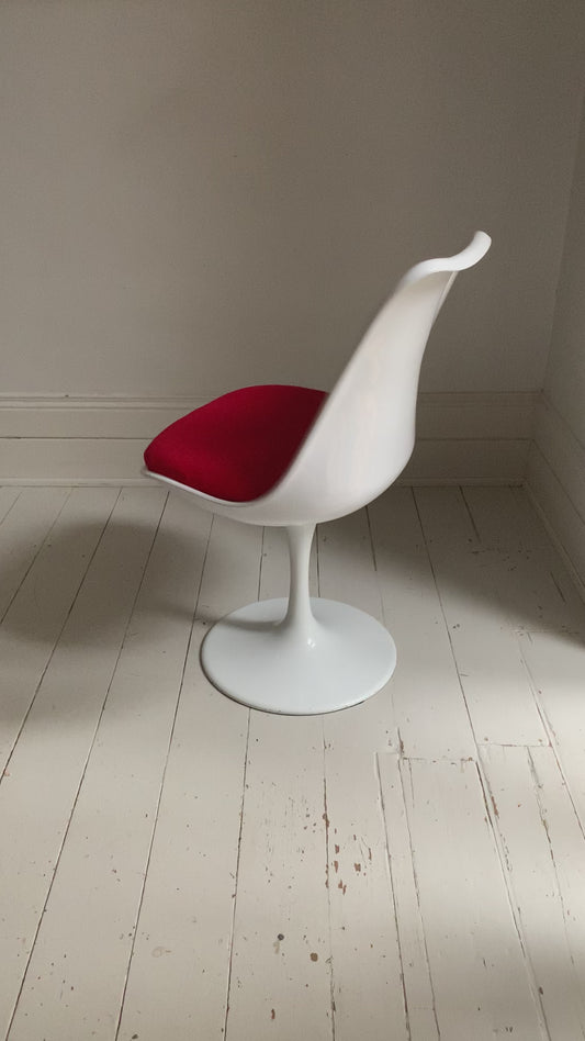 Pair Of Tulip White Gloss Chairs With Red Fabric Seats, Originally Designed by Eero Saarien