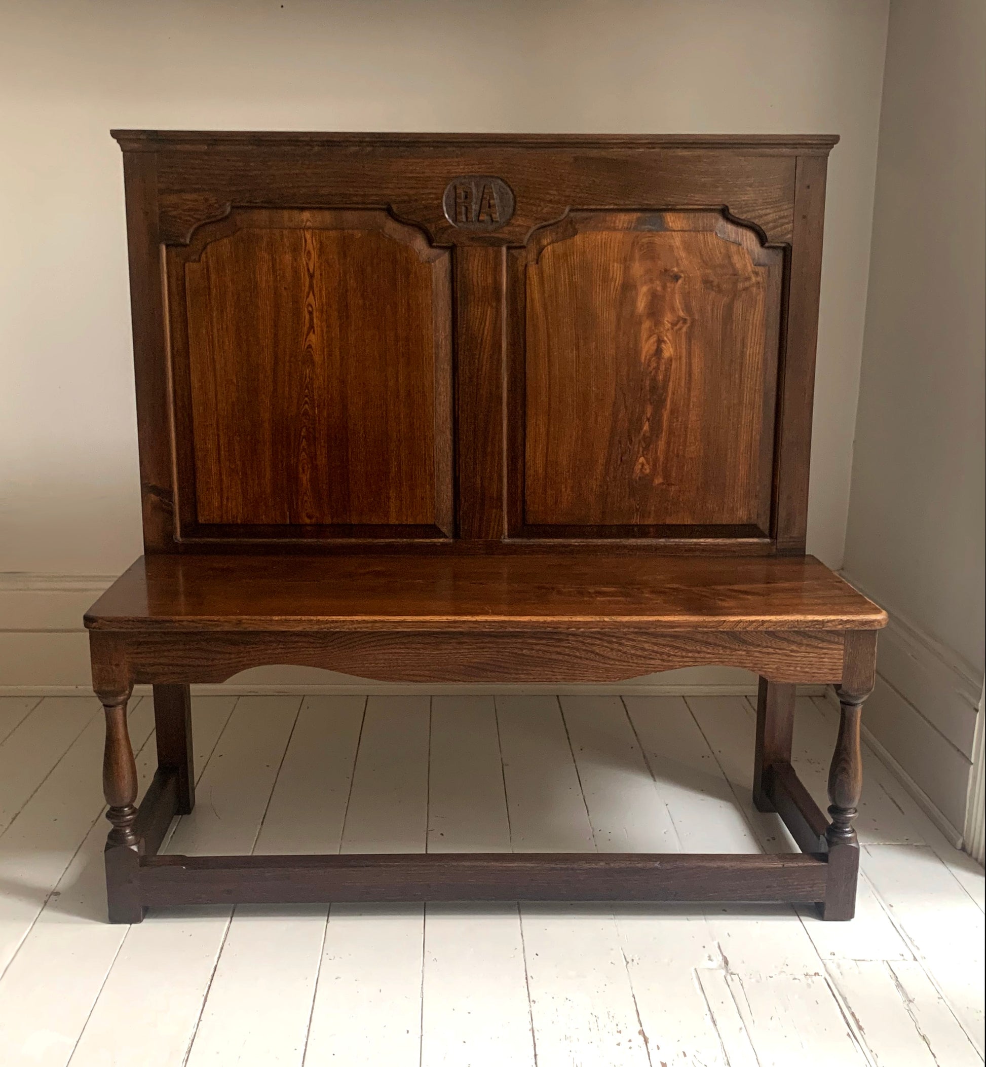 Antique Oak Panelled Back Settle Without Arms with RA Initial Carving