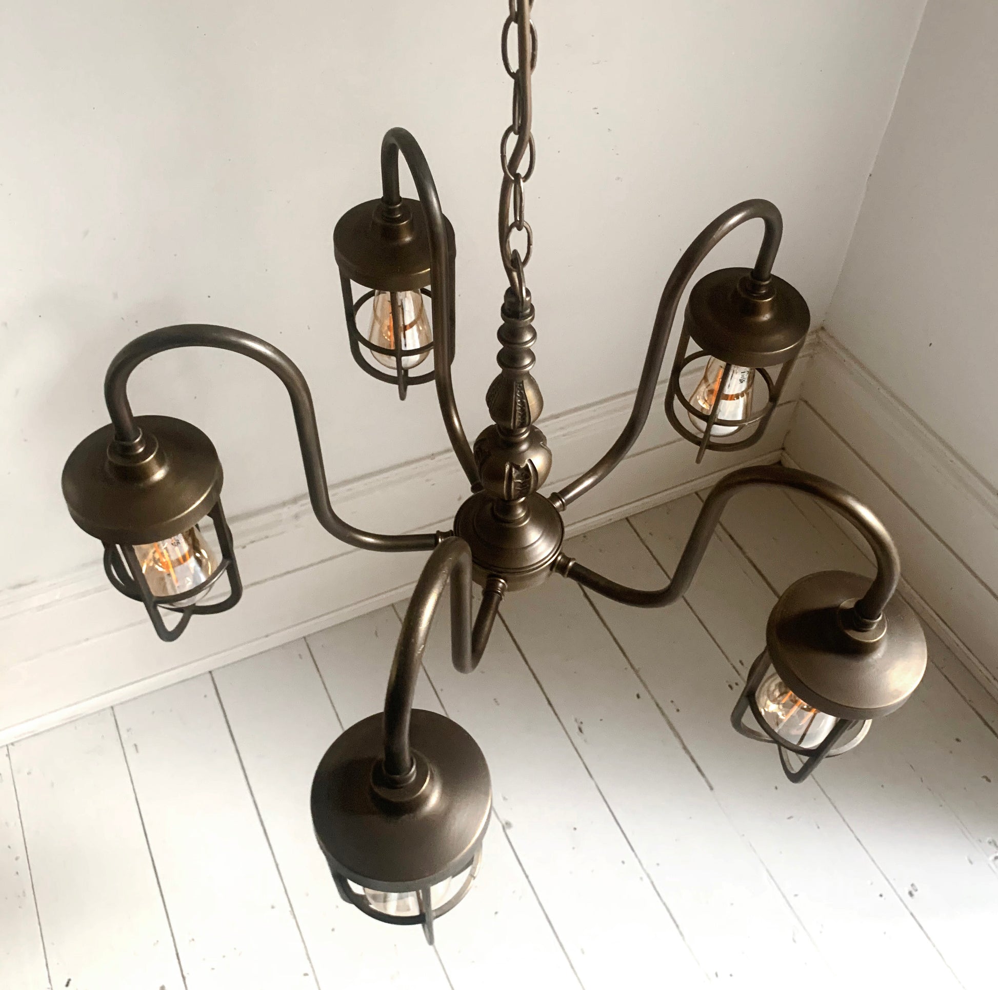 A stunning industrial style five arm chandelier with caged filament bulbs in a dark brushed metal.