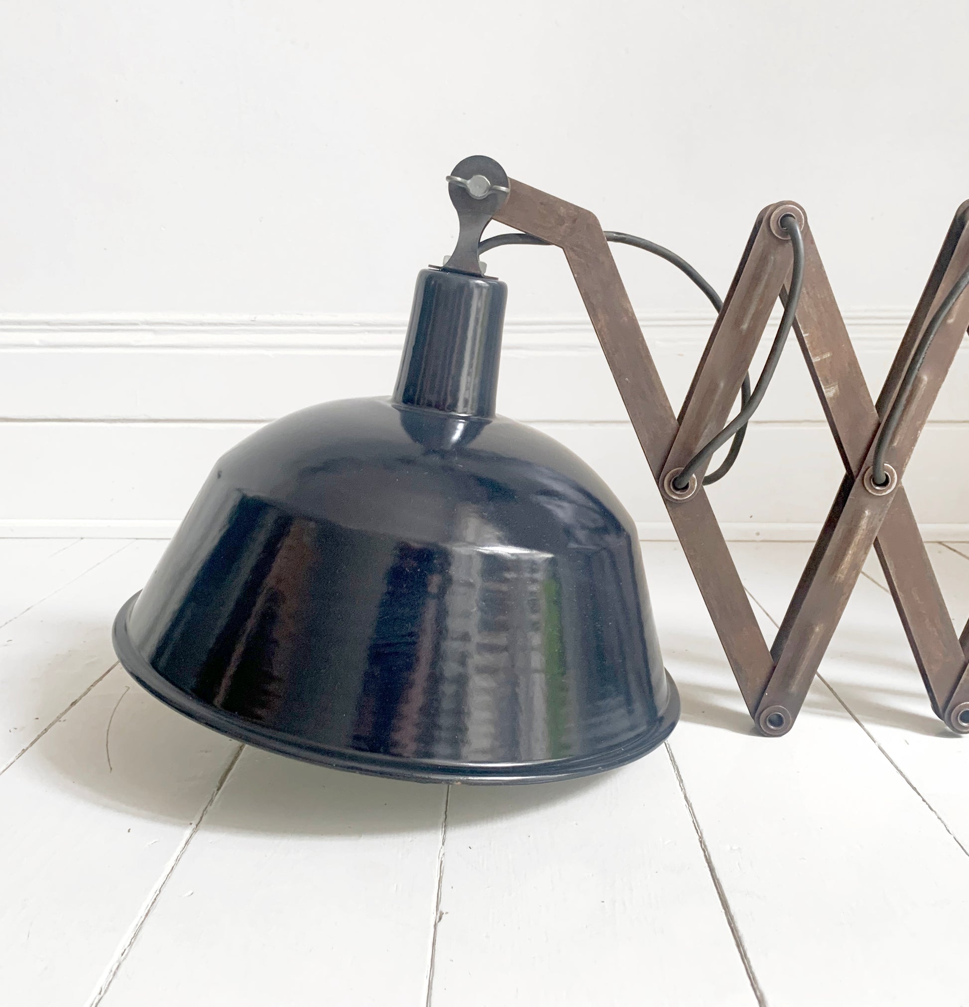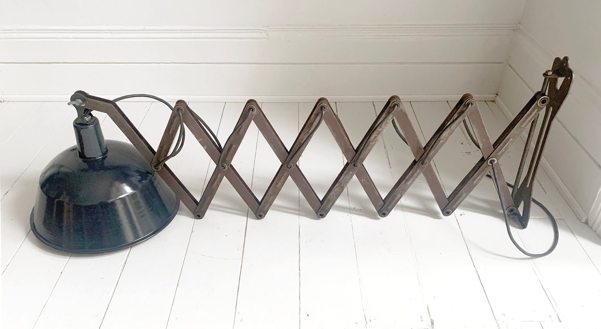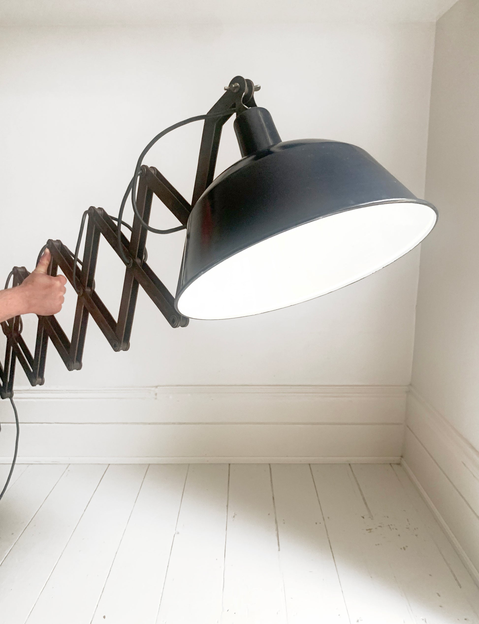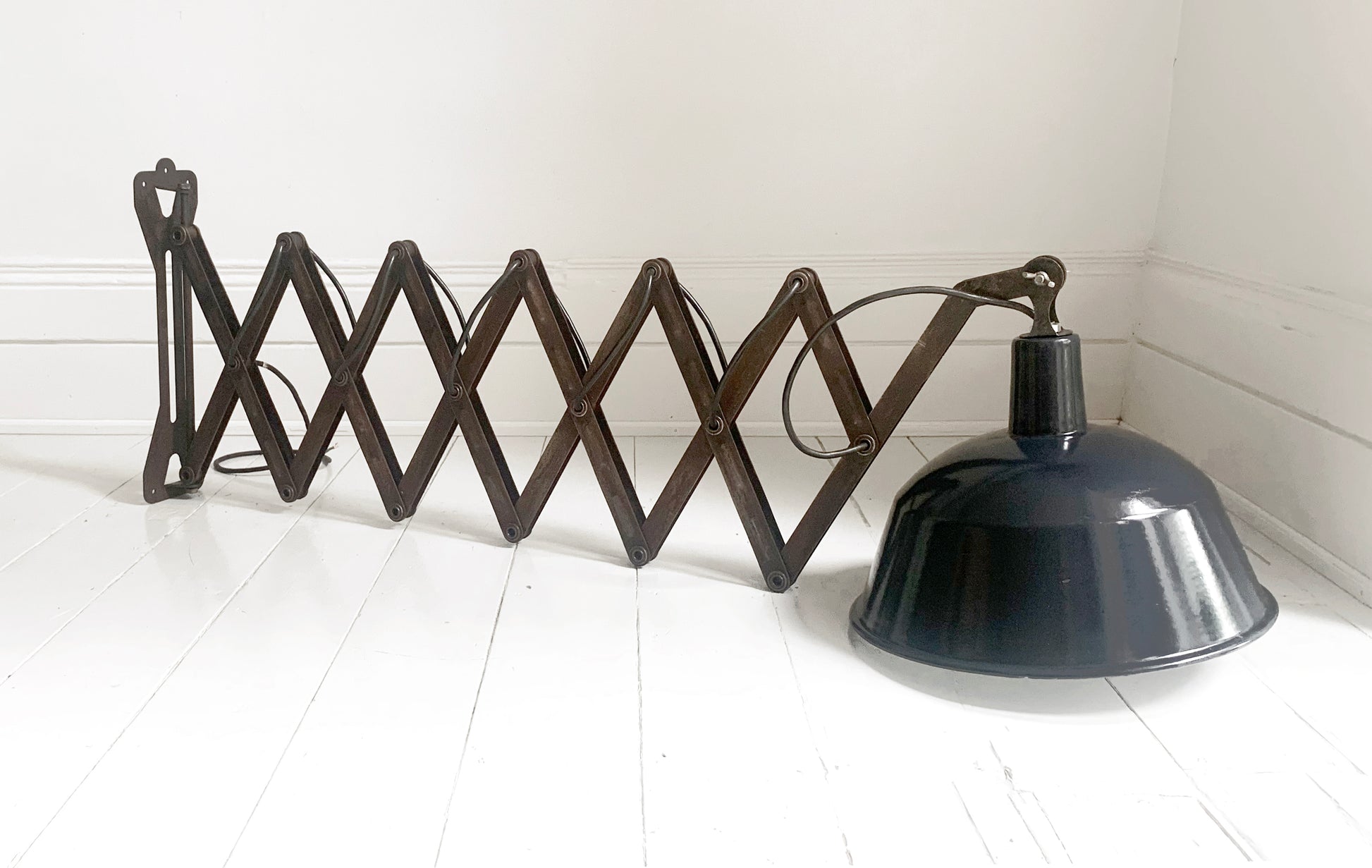 A stunning large vintage French enamel industrial scissor lamp.