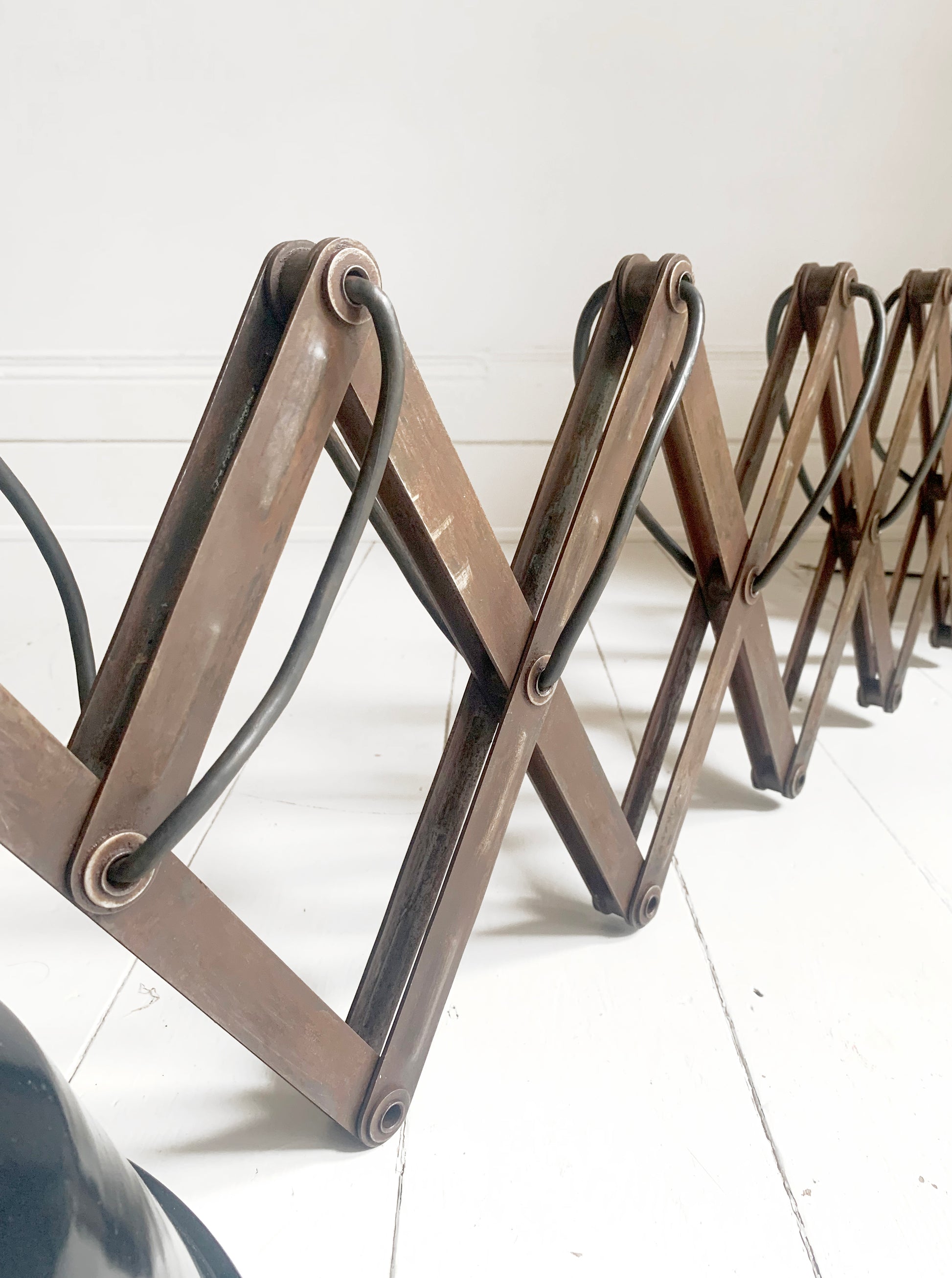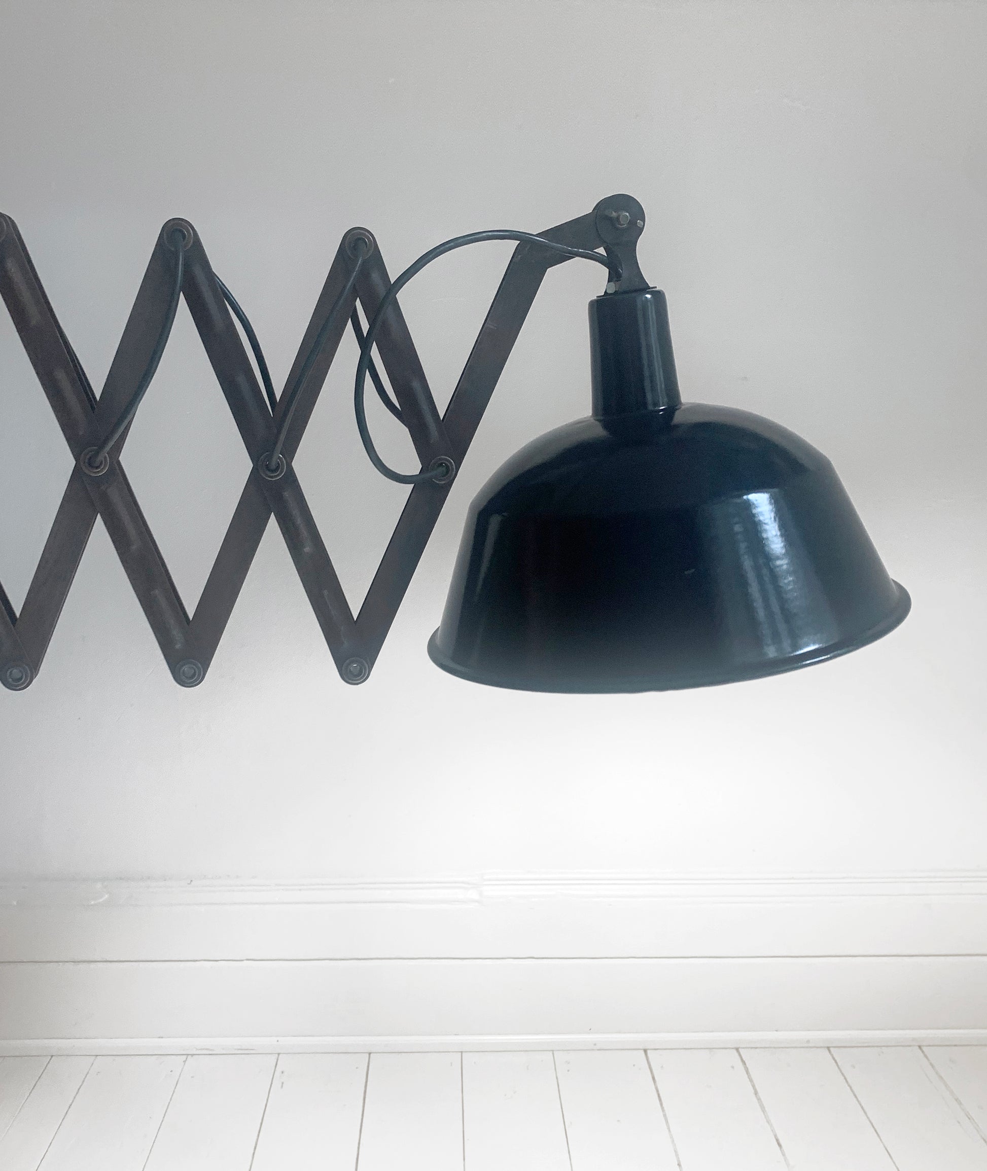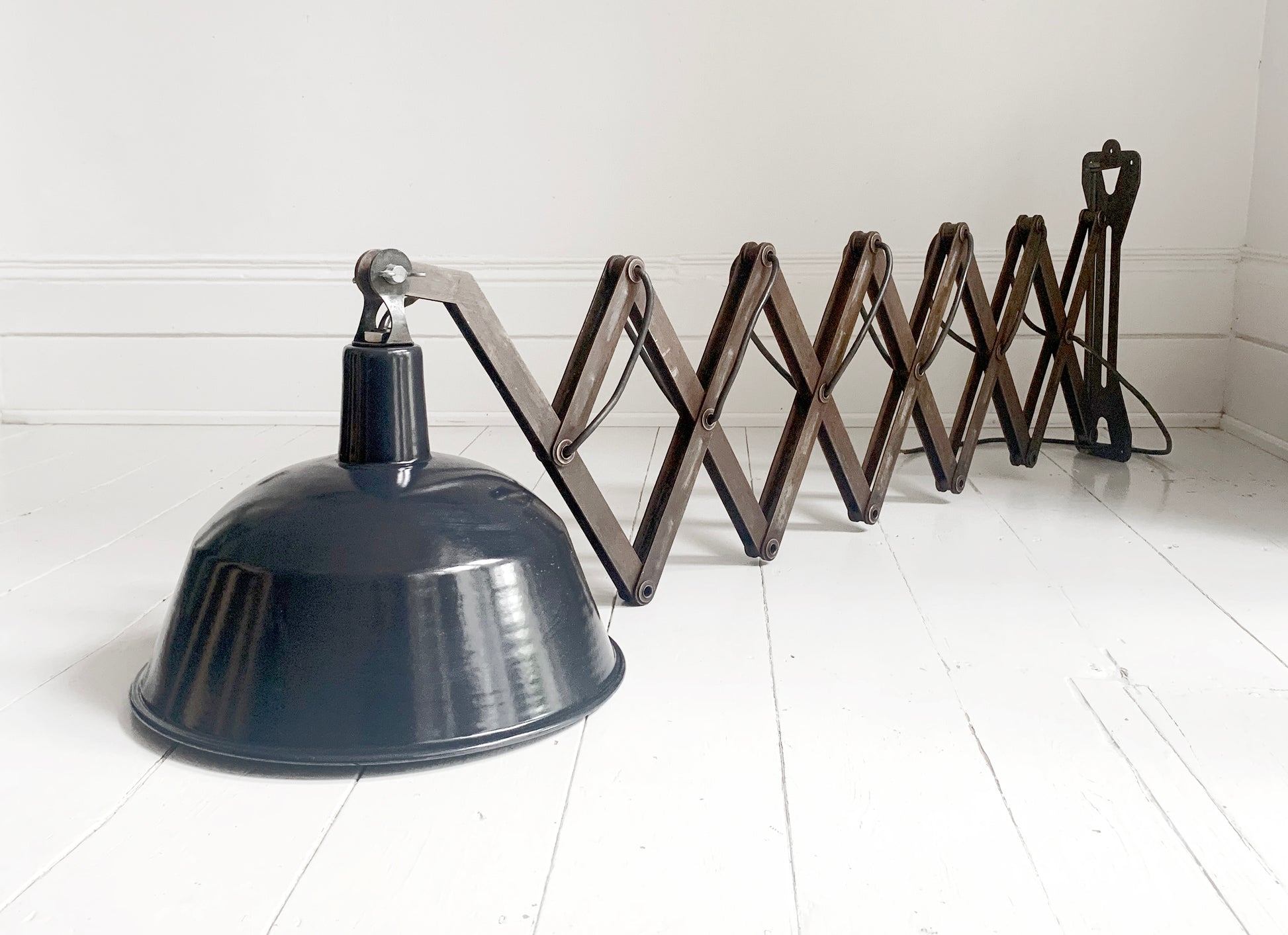 A stunning large vintage French enamel industrial scissor lamp.