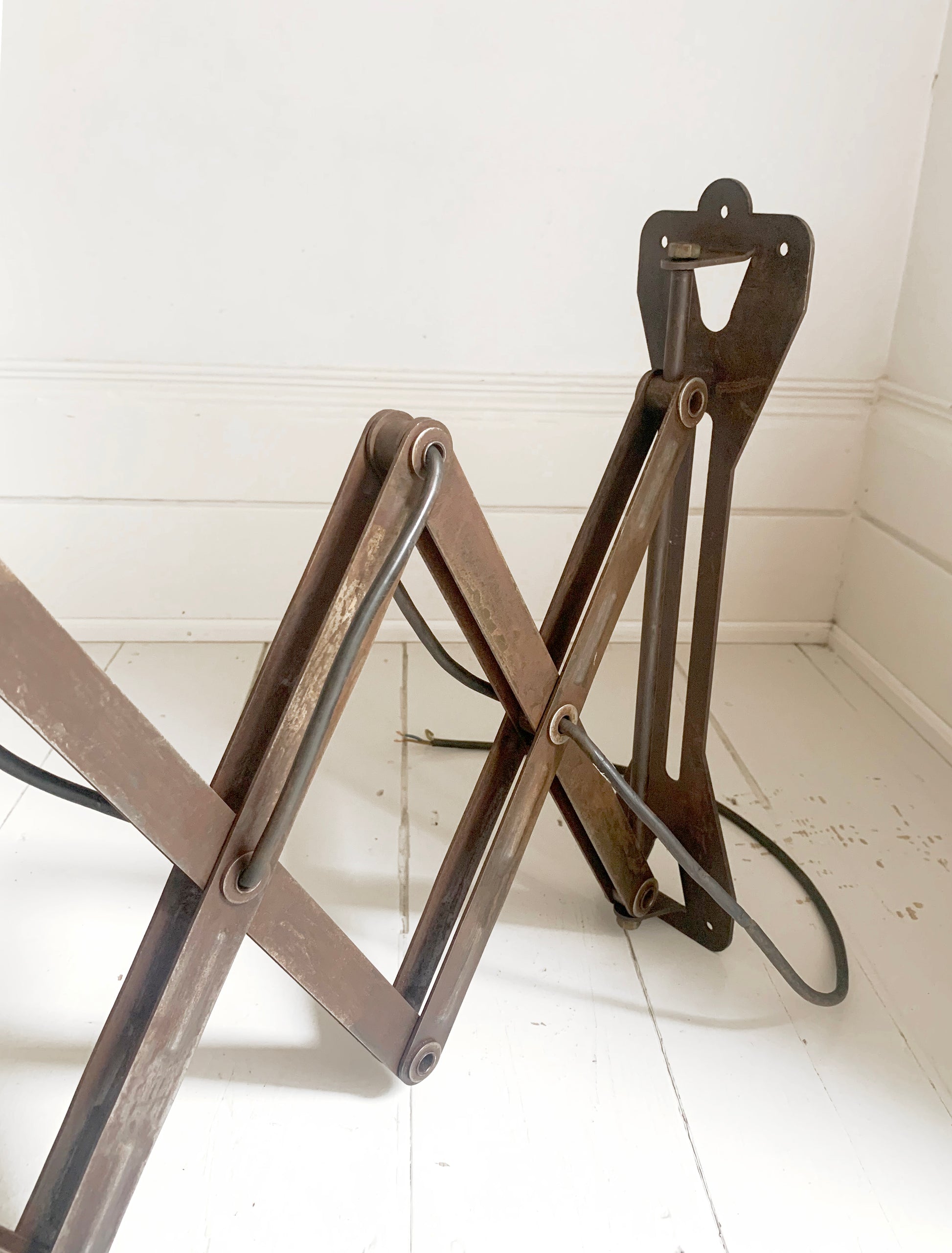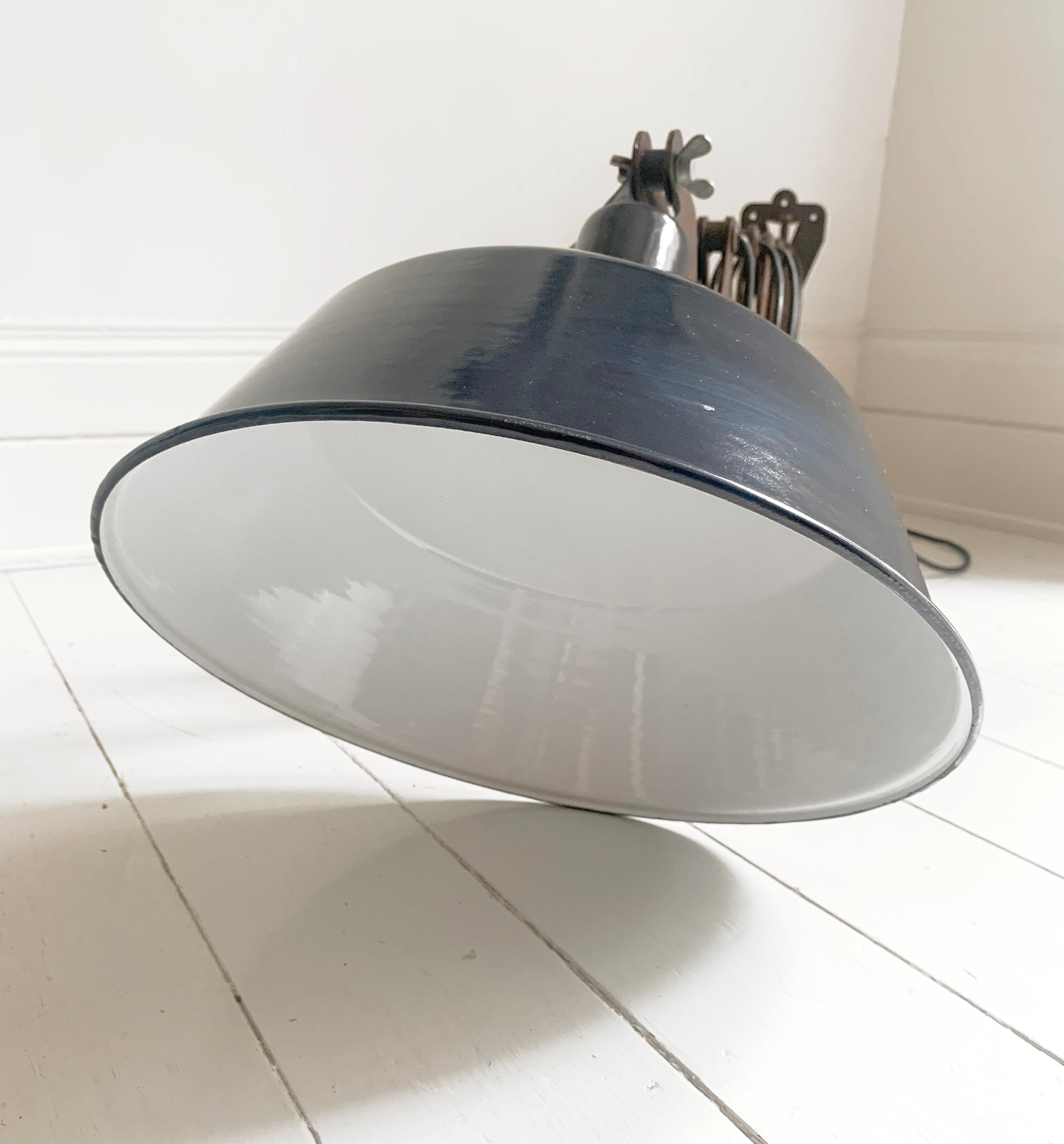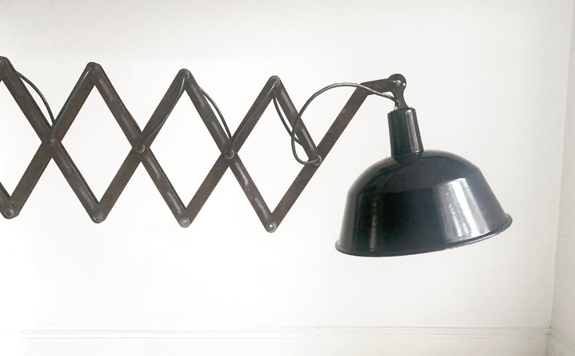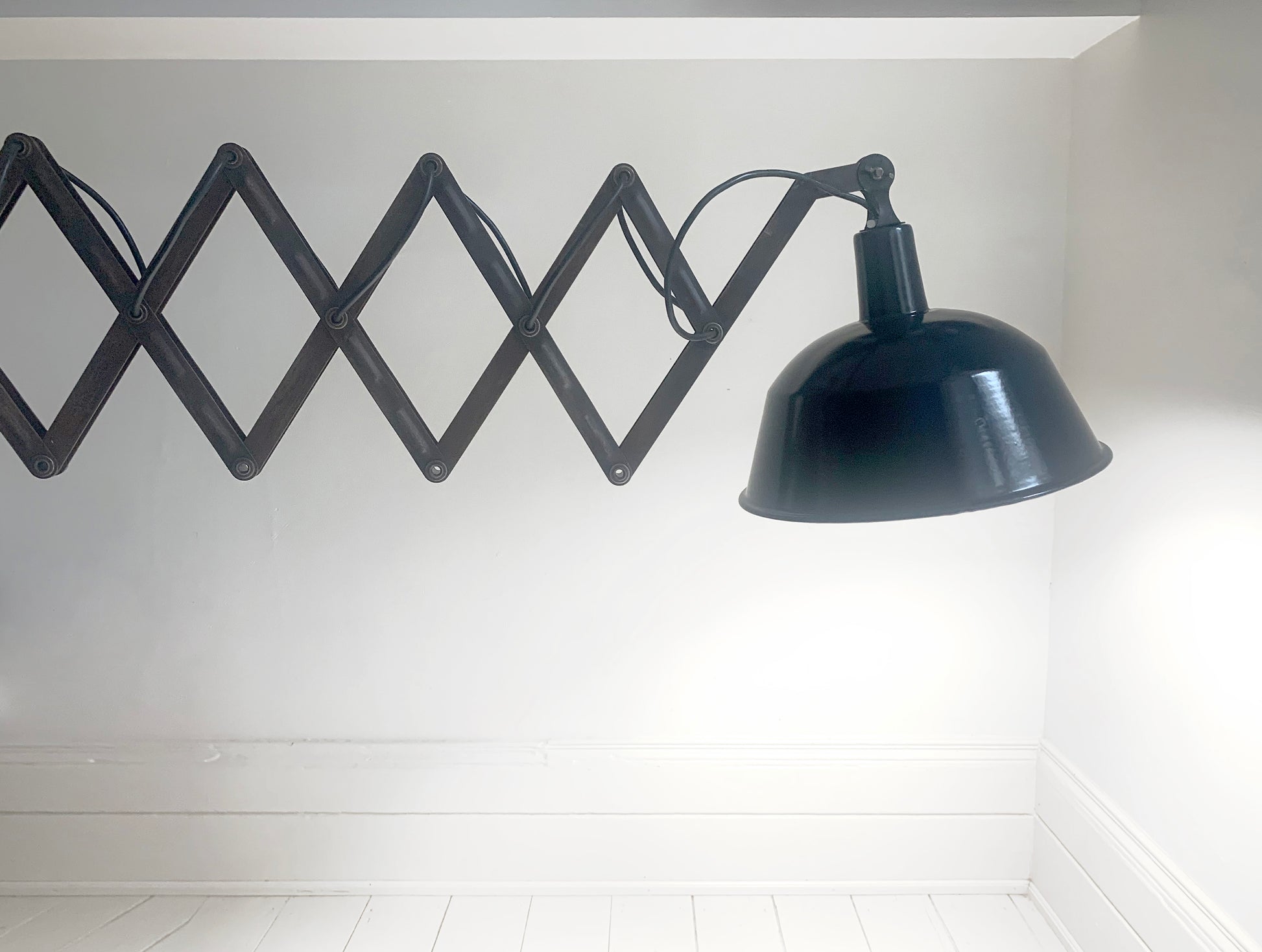 A stunning large vintage French enamel industrial scissor lamp.