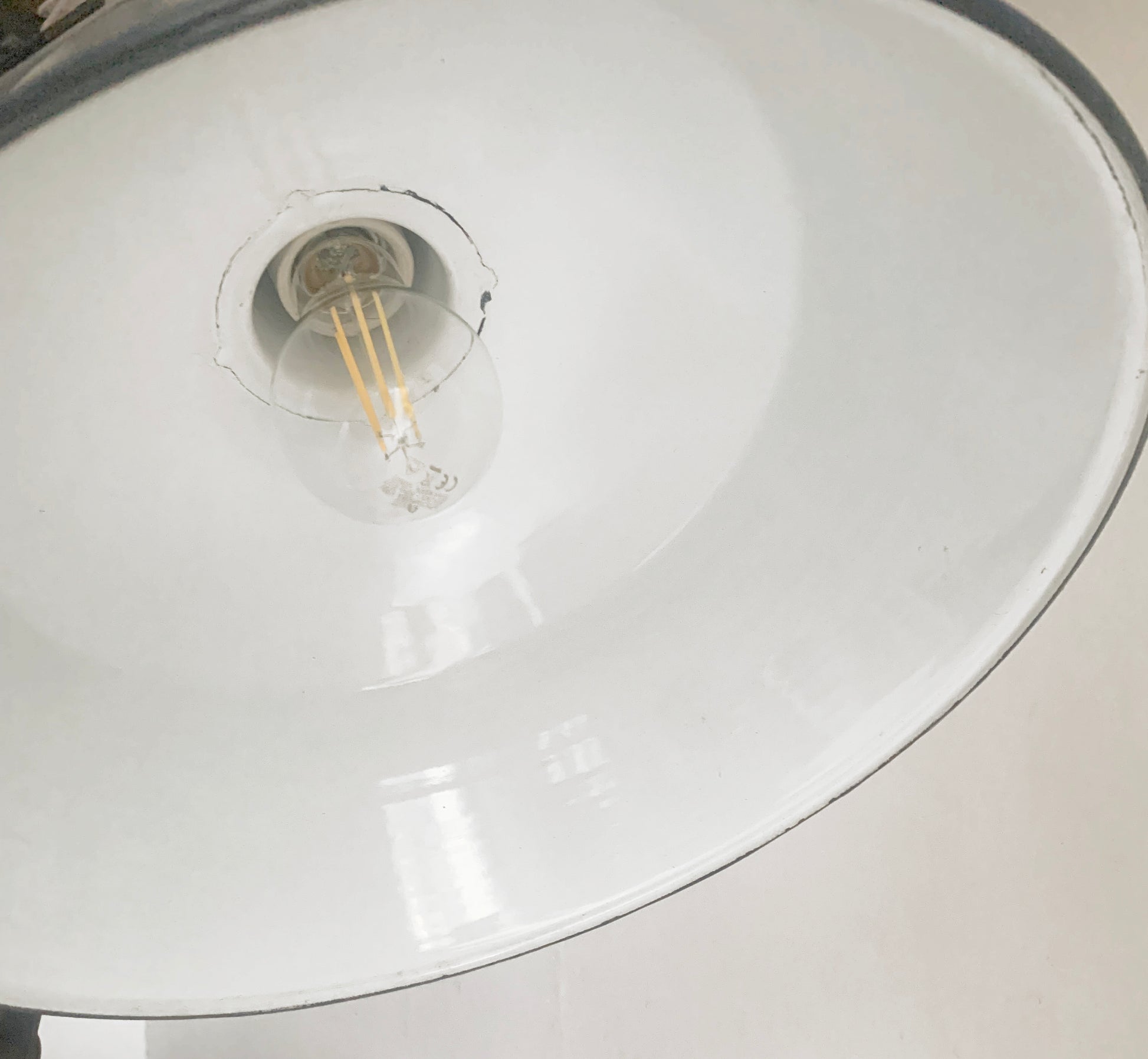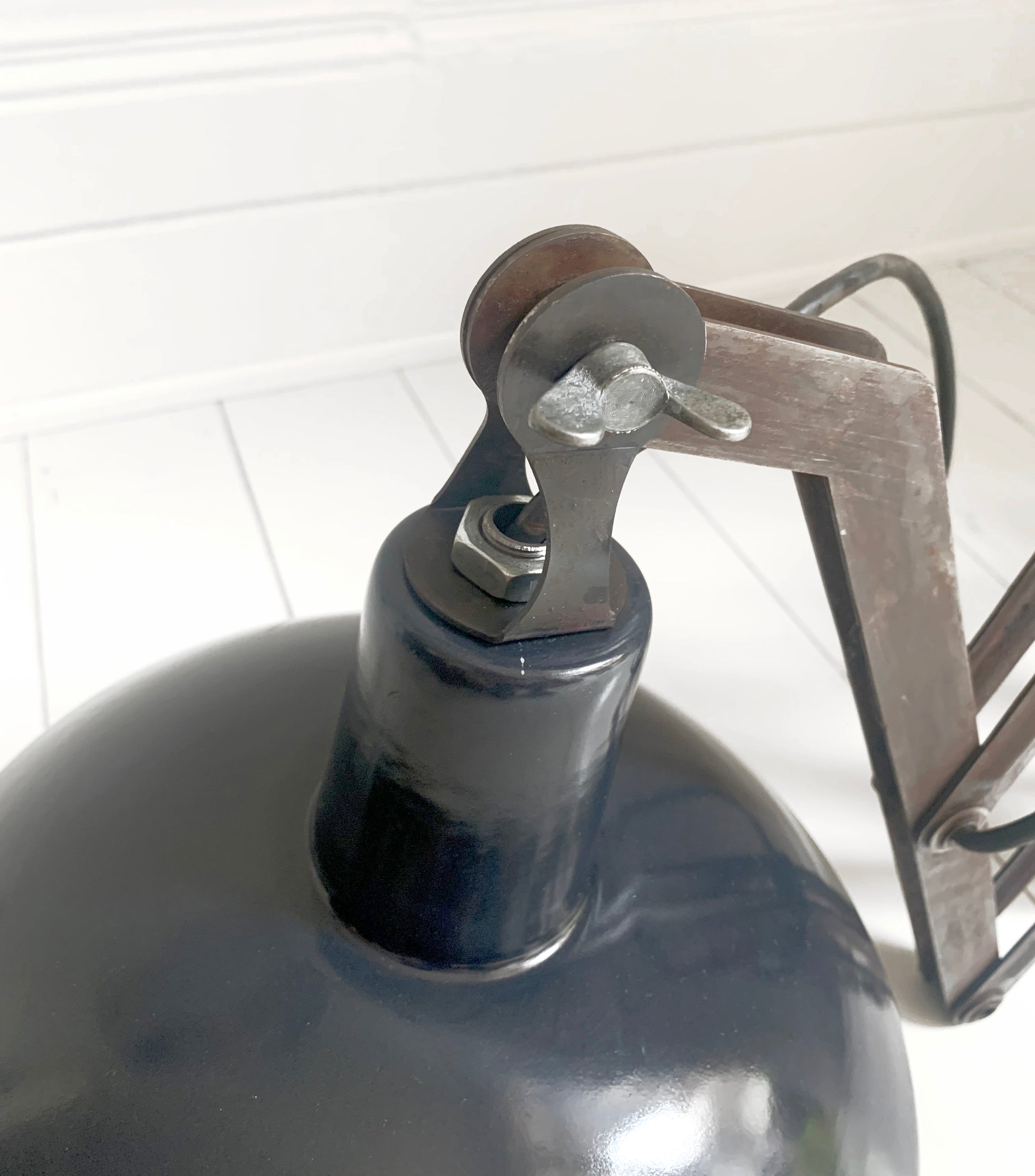 The enamel shade is a dark grey, almost black colour, it is in excellent condition with no chips. The scissor mechanism is also in excellent condition, it extends perfectly, the surface has an oiled rust patina. Please check out the attached photos for more details.