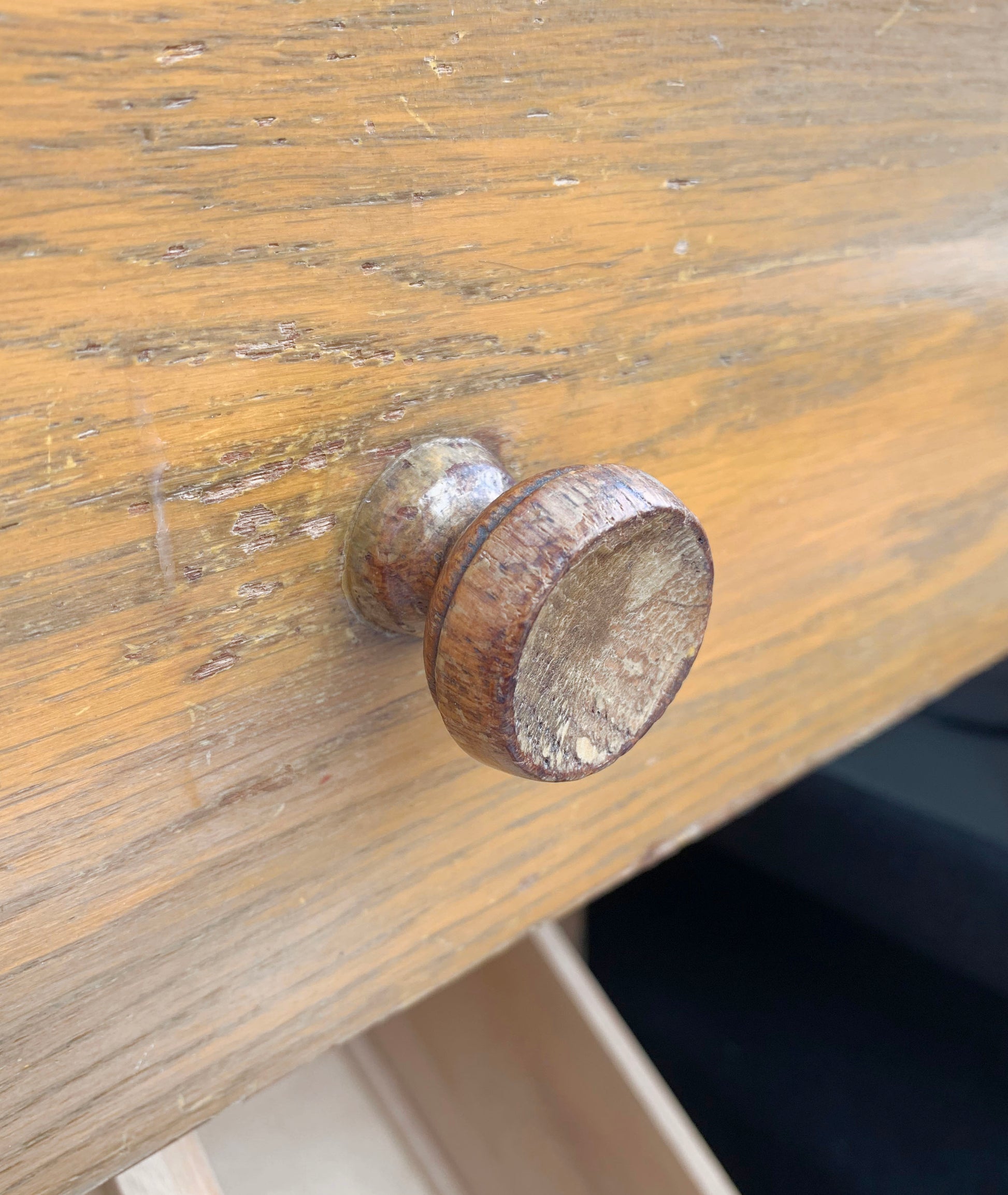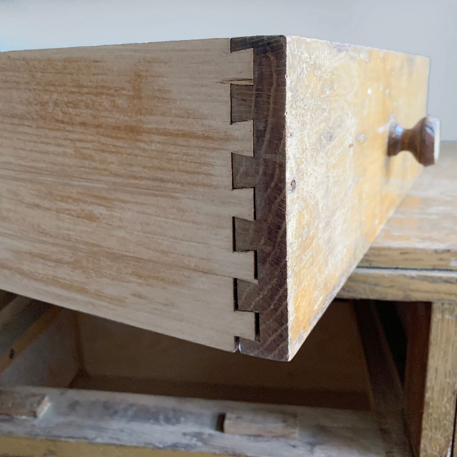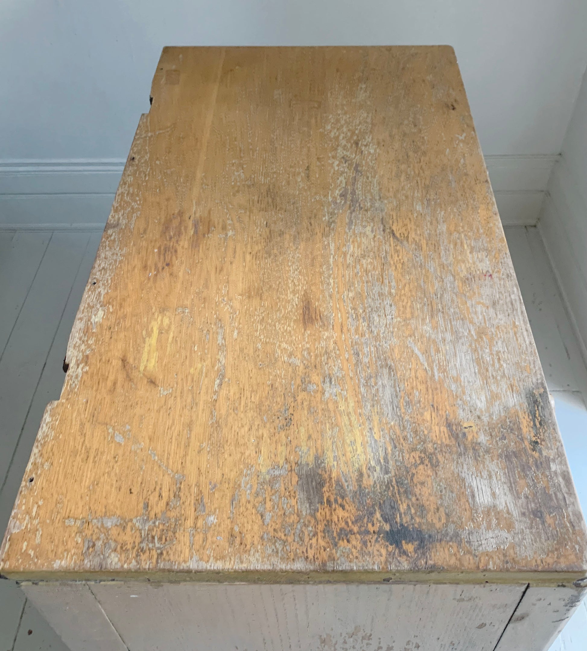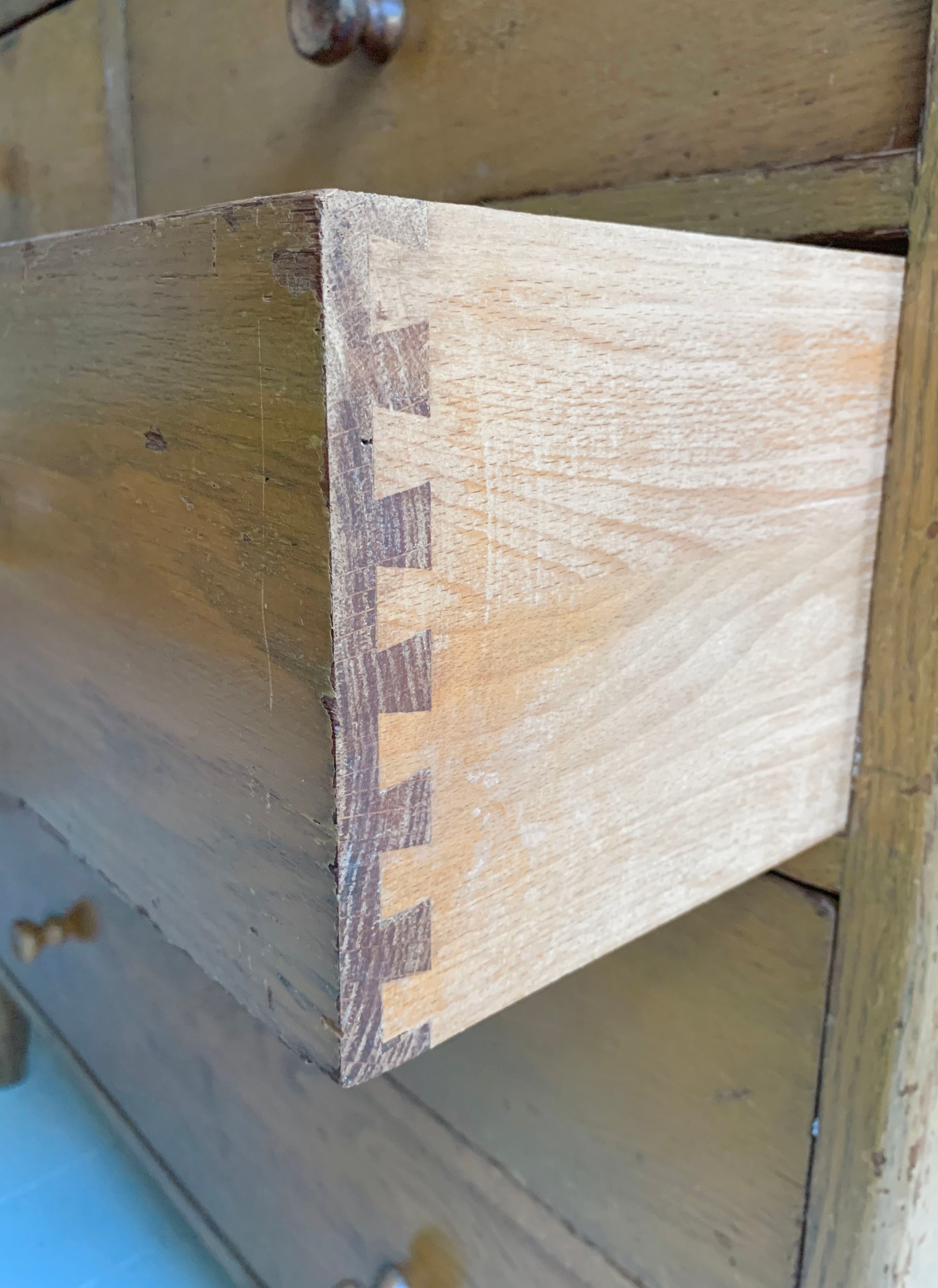 The chest of drawers are in good/decent condition, the frame is firm & solid. At some in the past a coat of varnish has been applied over the original finish, this is now flaking off. This gives the drawers a really cool aged patina, this could be keep, or the drawers could be refinished. Two of the rear drawer joints are slightly cracked. Please see attached photos for more details.