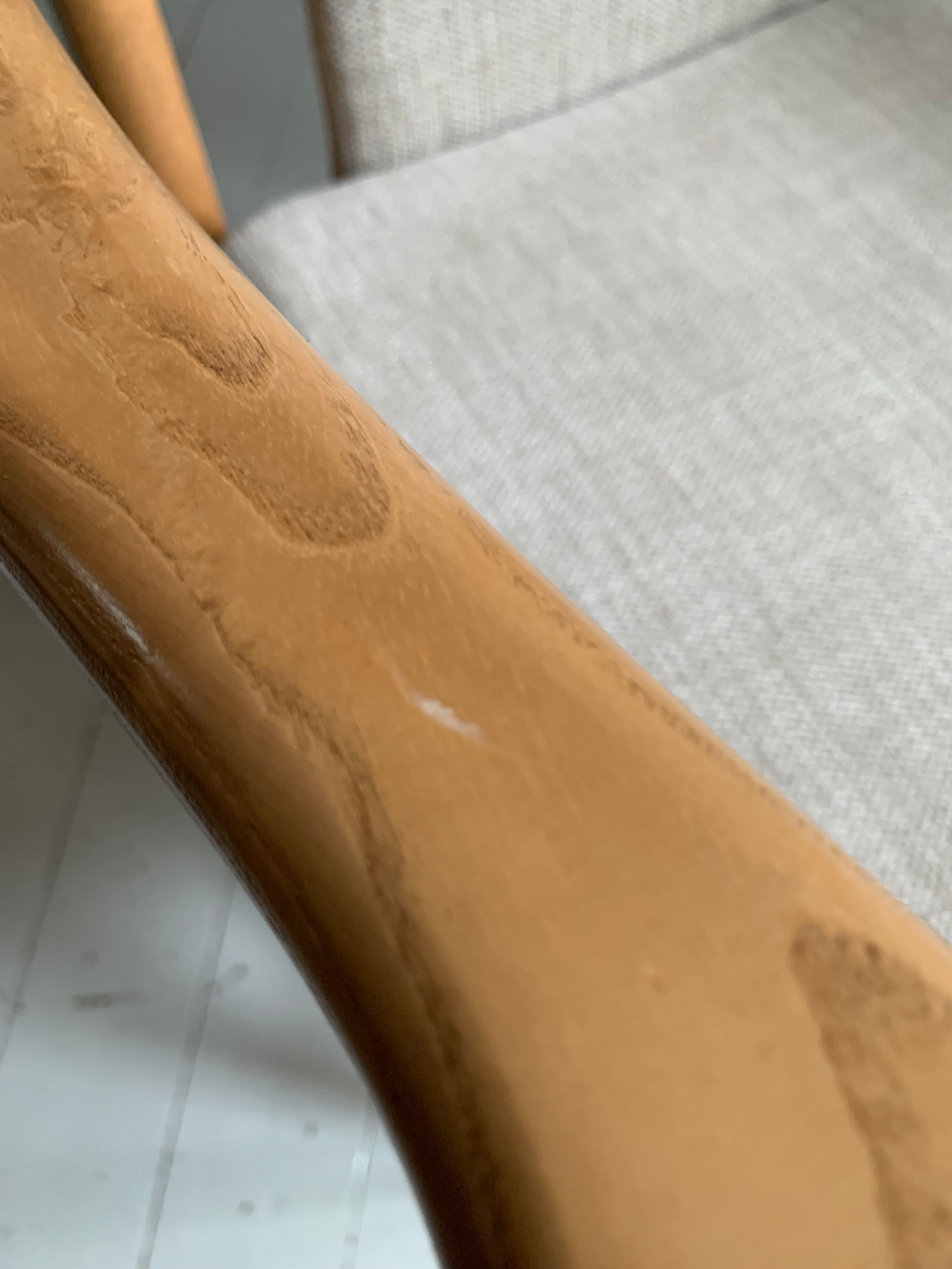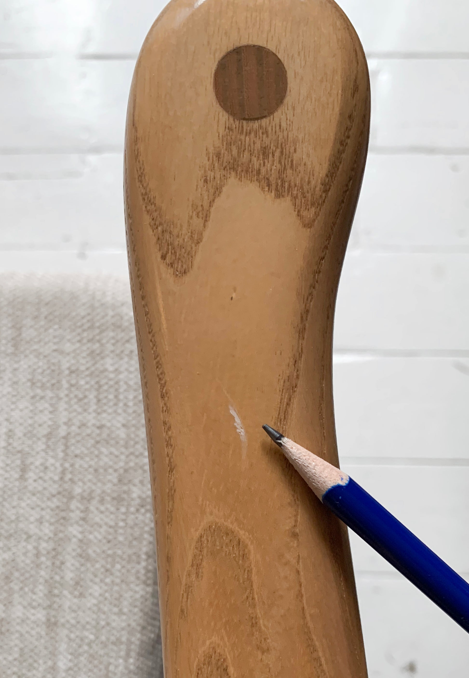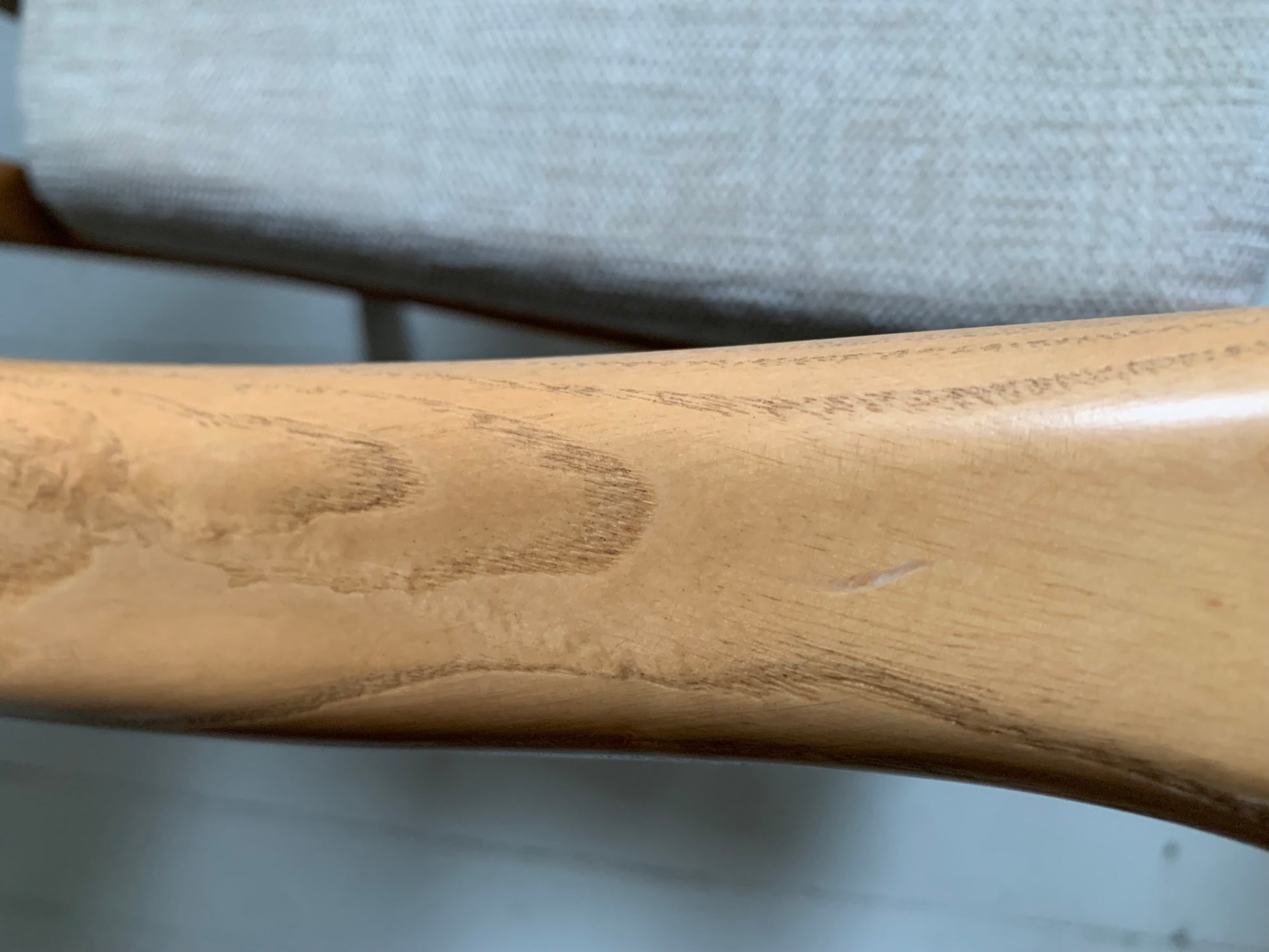 The chairs are in excellent, virtually unused condition with only a couple of points to mention. One chair has one mark on the arm rest, the other chair has two minor dings, one to the leg , the other on the arm.