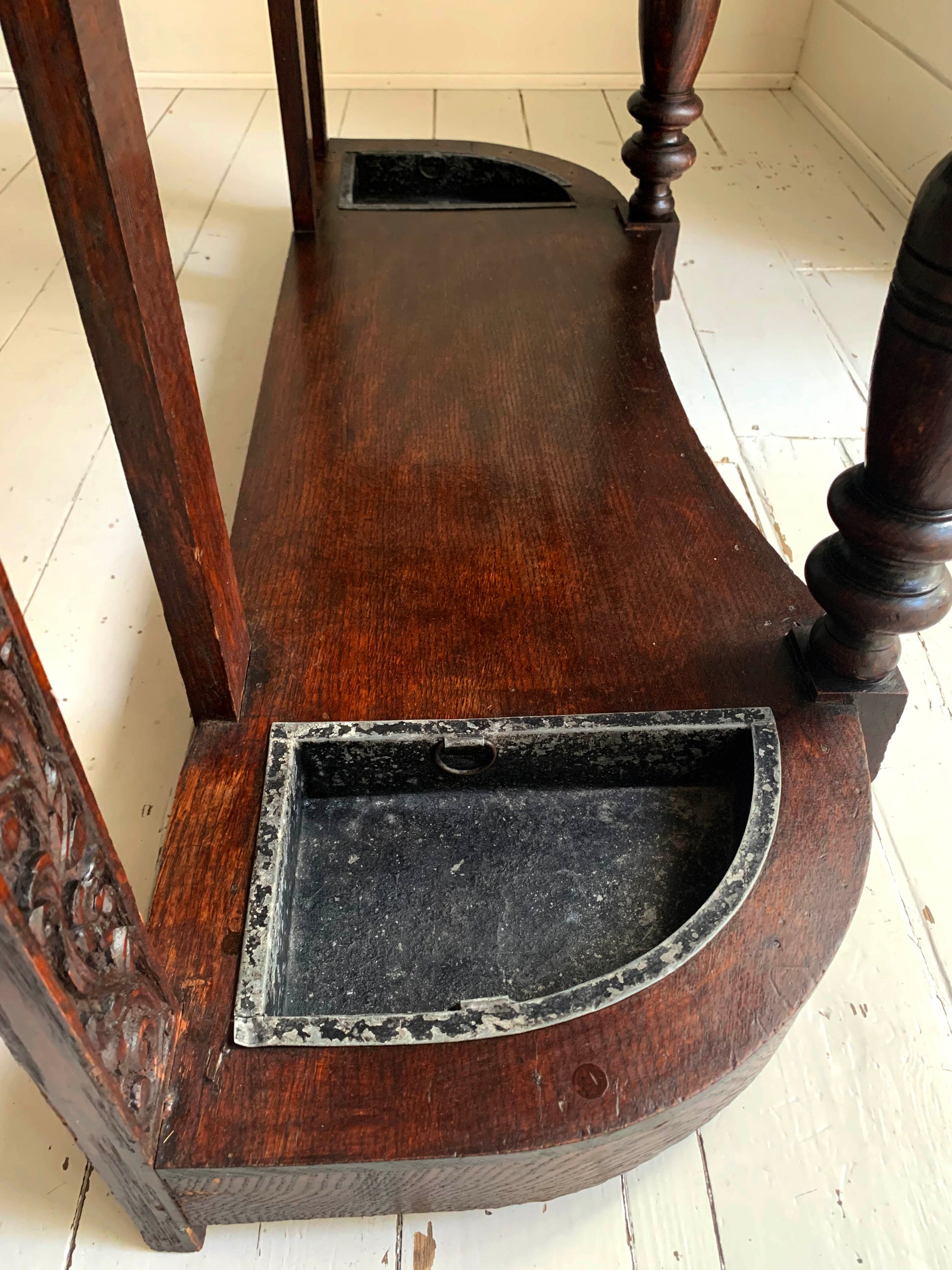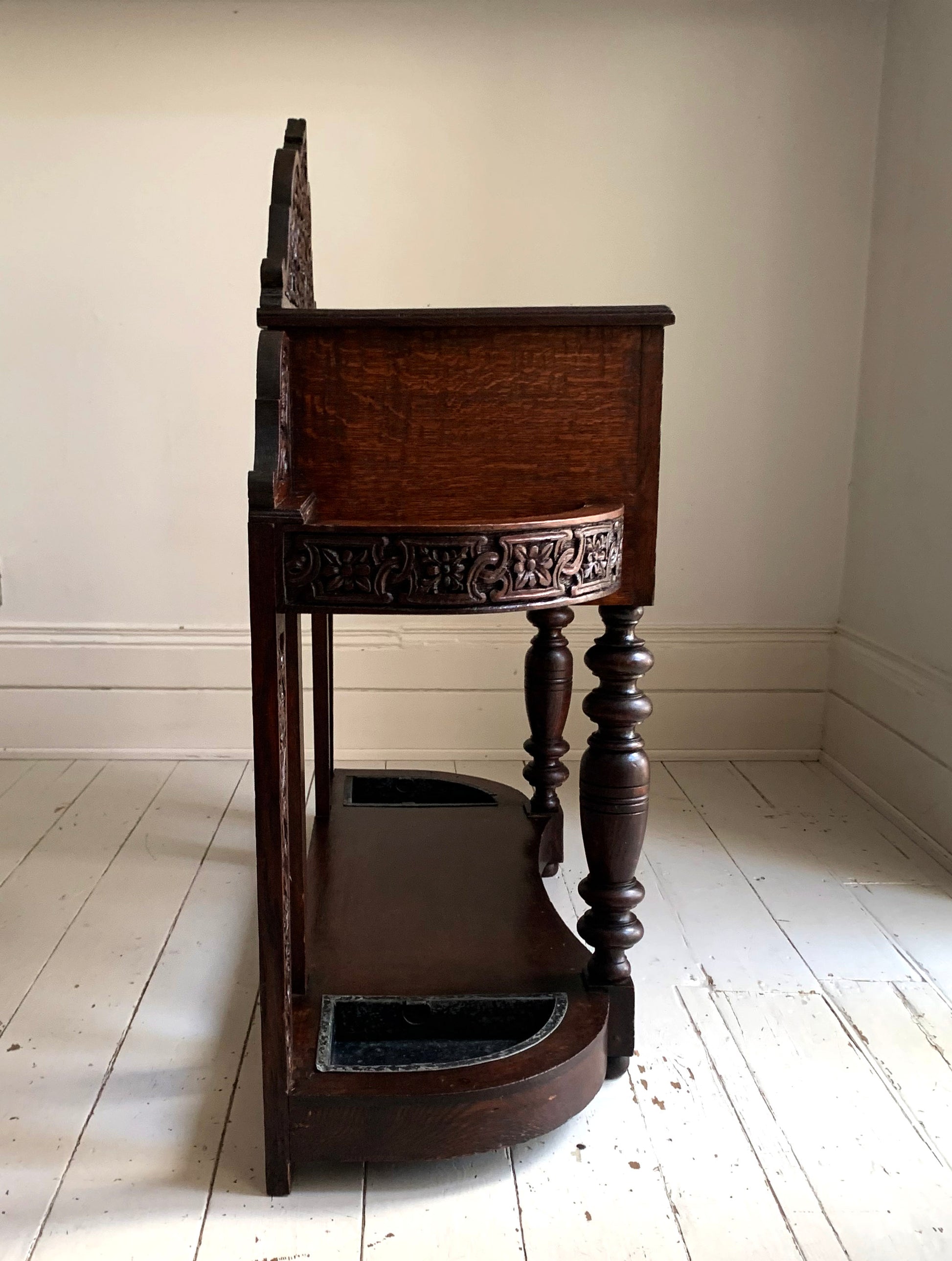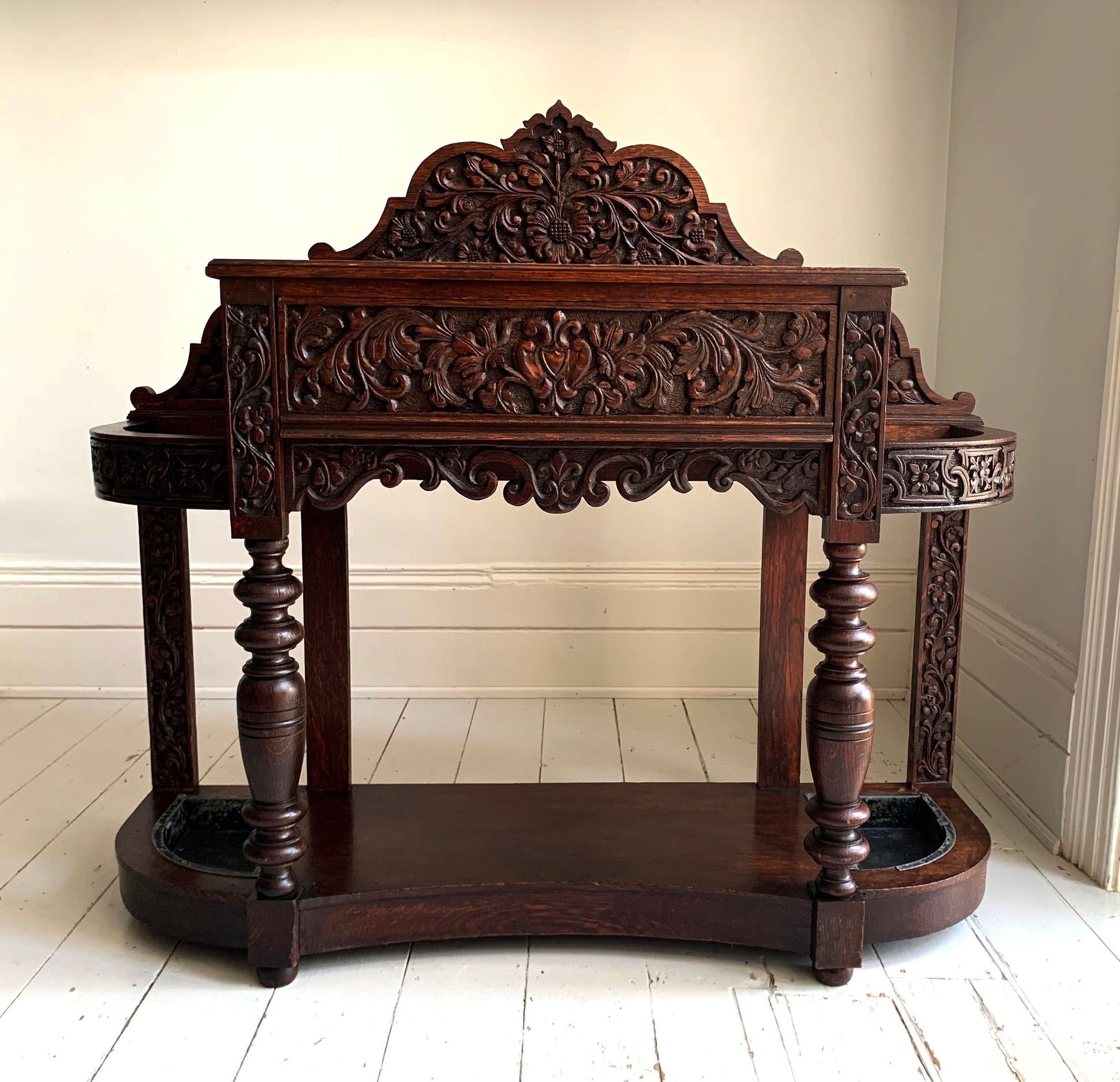The beautifully carved back gallery featuring flower and leaf motifs is mirrored on the front of the drawer and round the curved umbrella/stick holders.