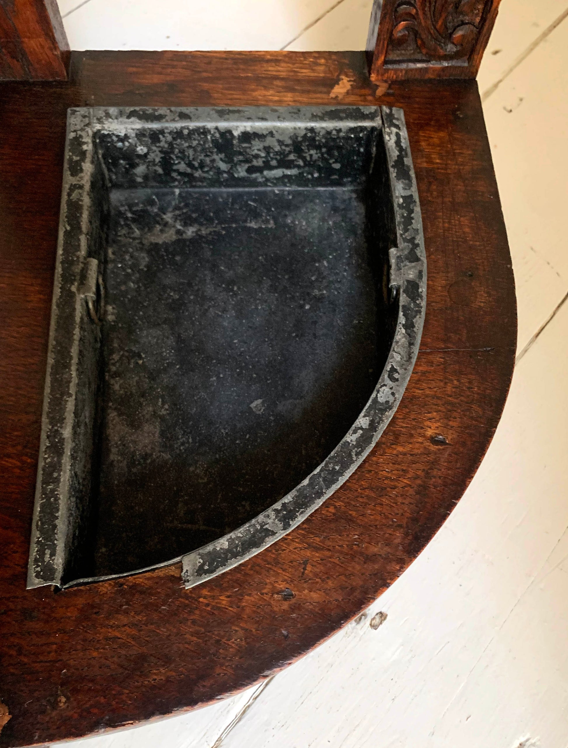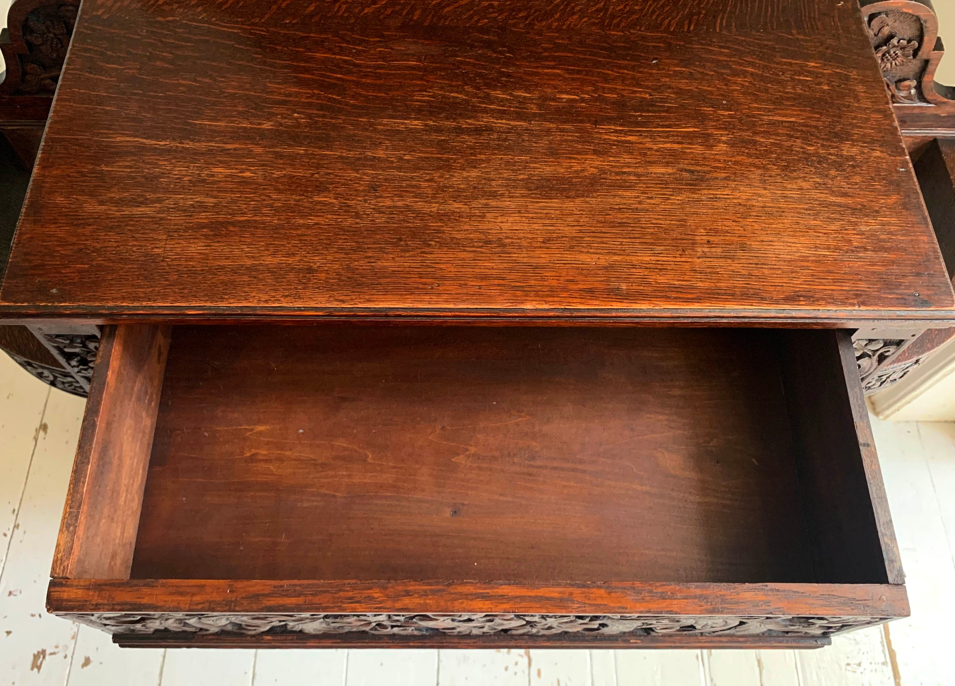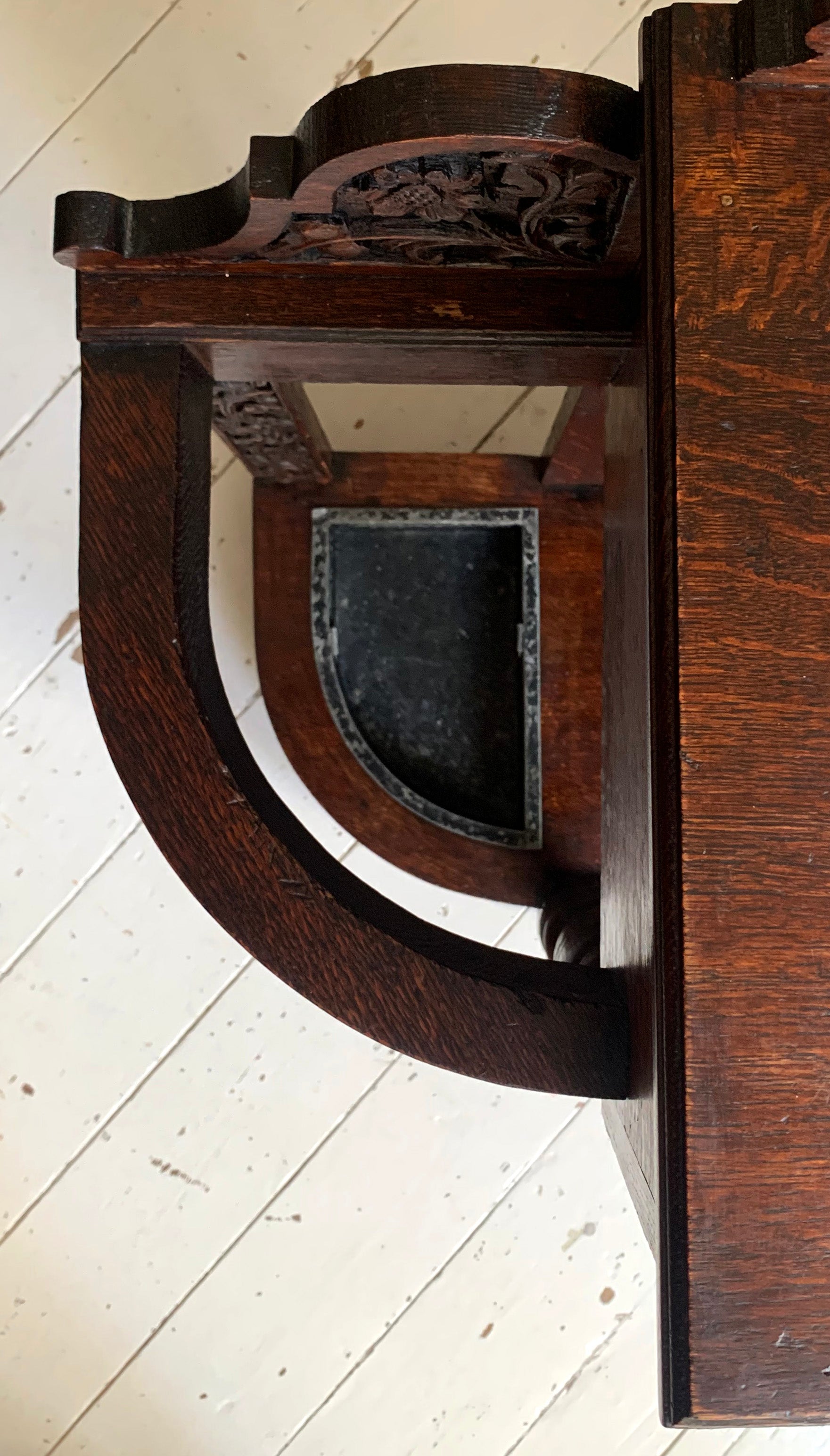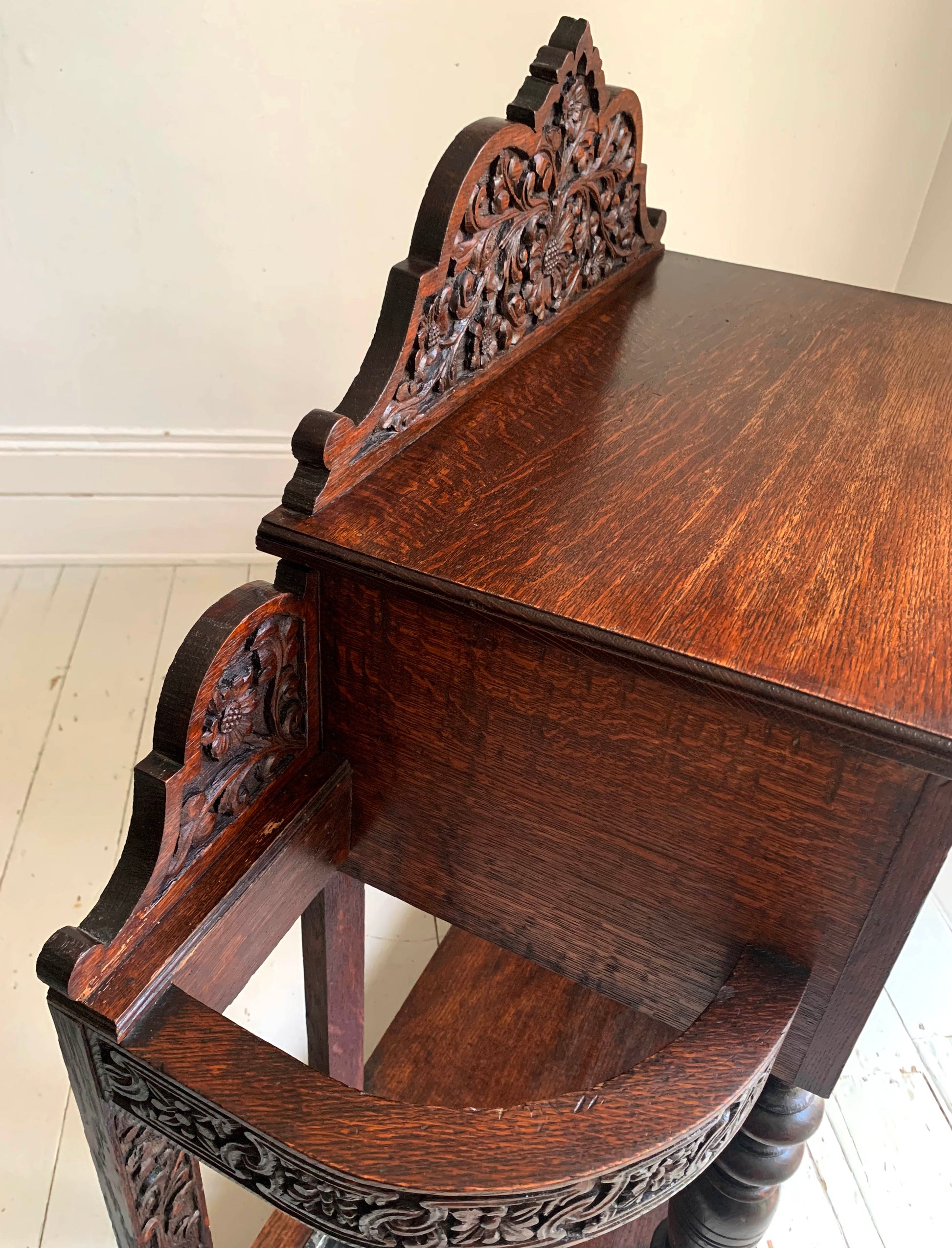 The beautifully carved back gallery featuring flower and leaf motifs is mirrored on the front of the drawer and round the curved umbrella/stick holders.