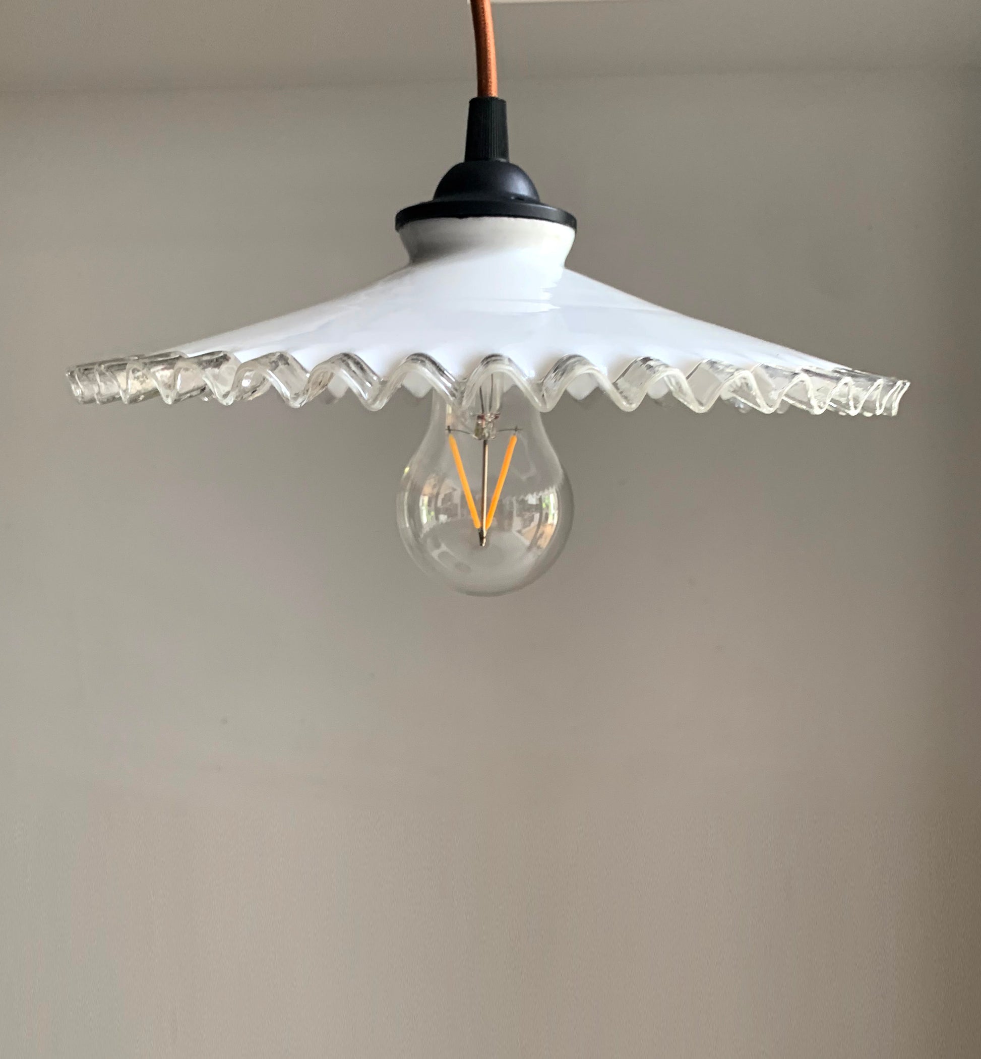 Vintage French Opaline Pendant Glass Shade With Crinkle Frilly Transparent Edge