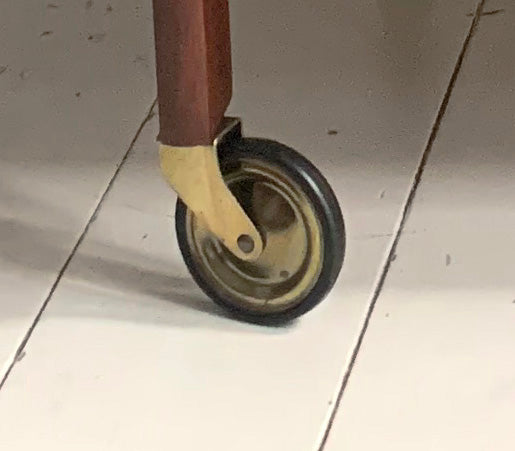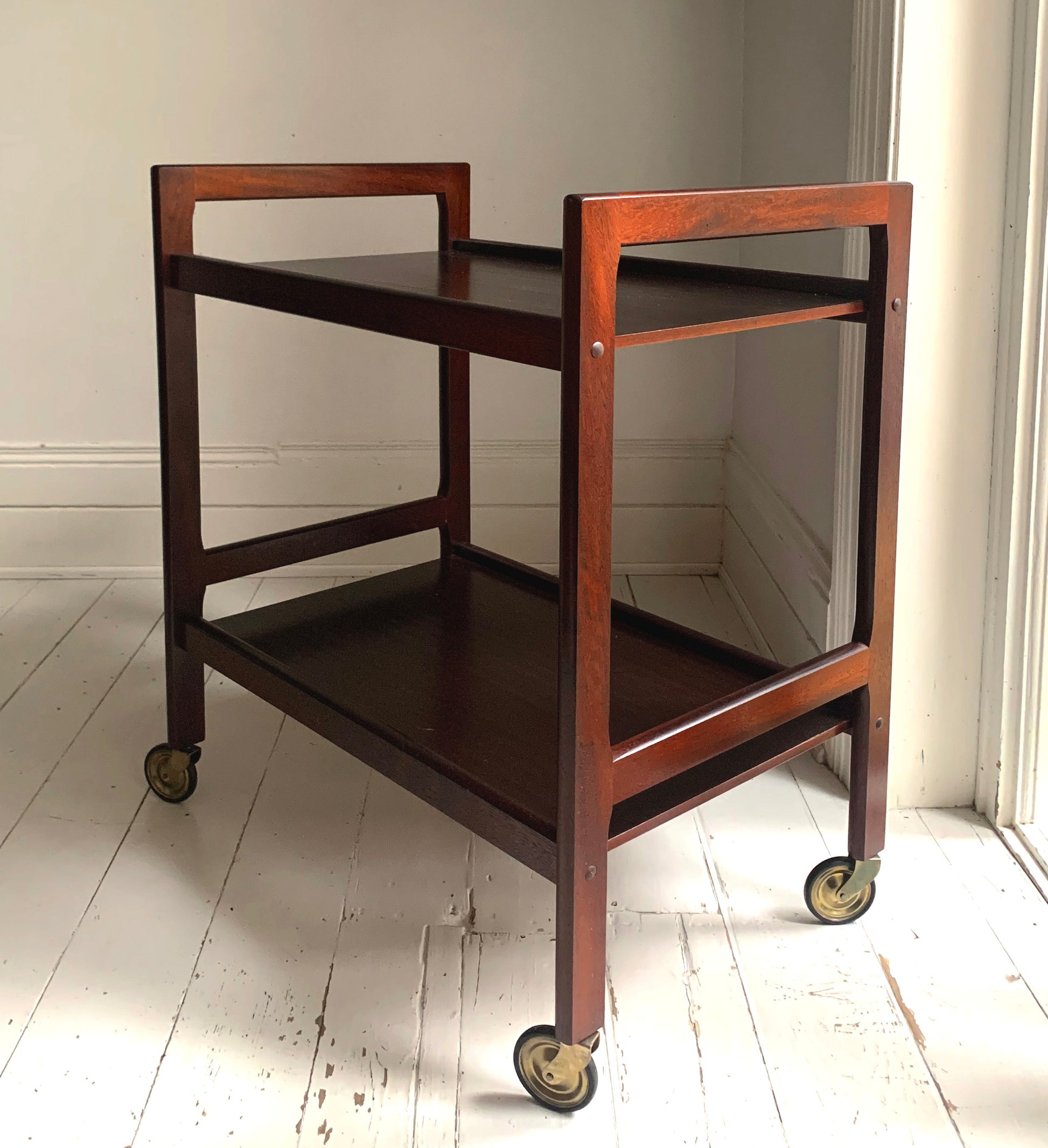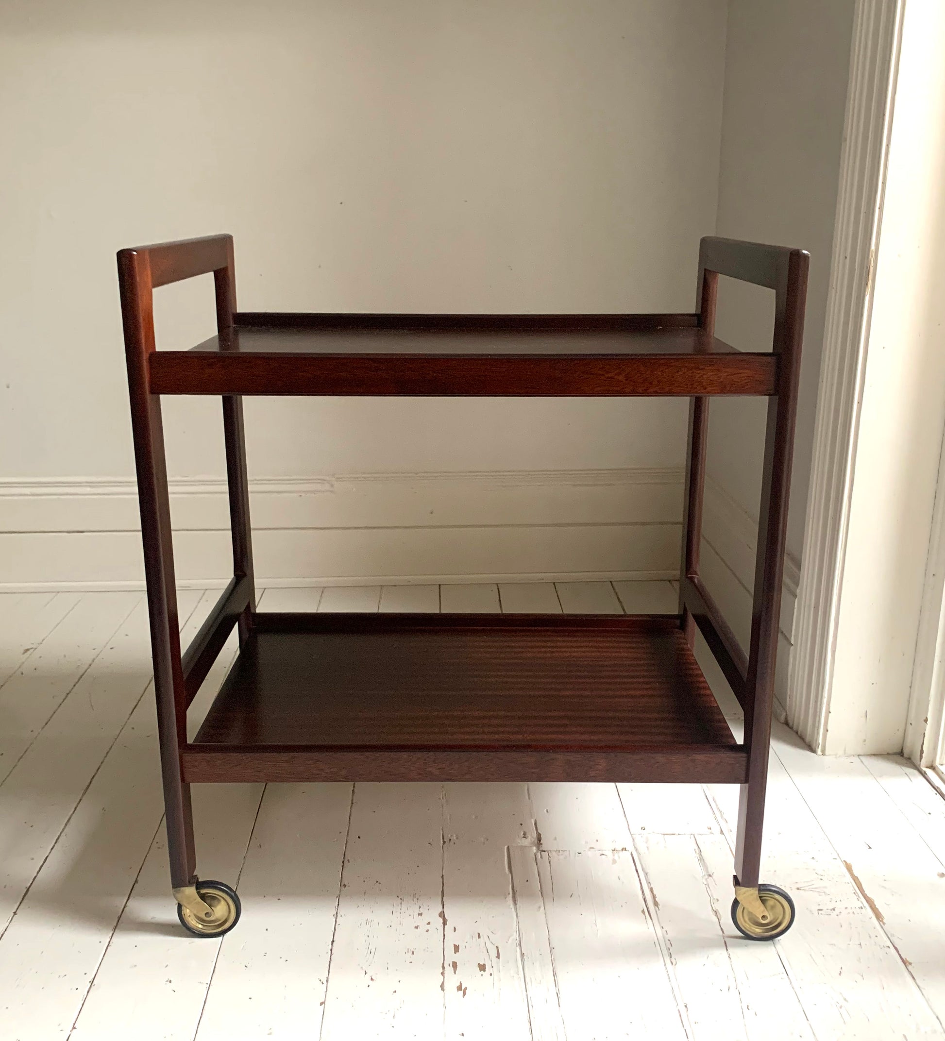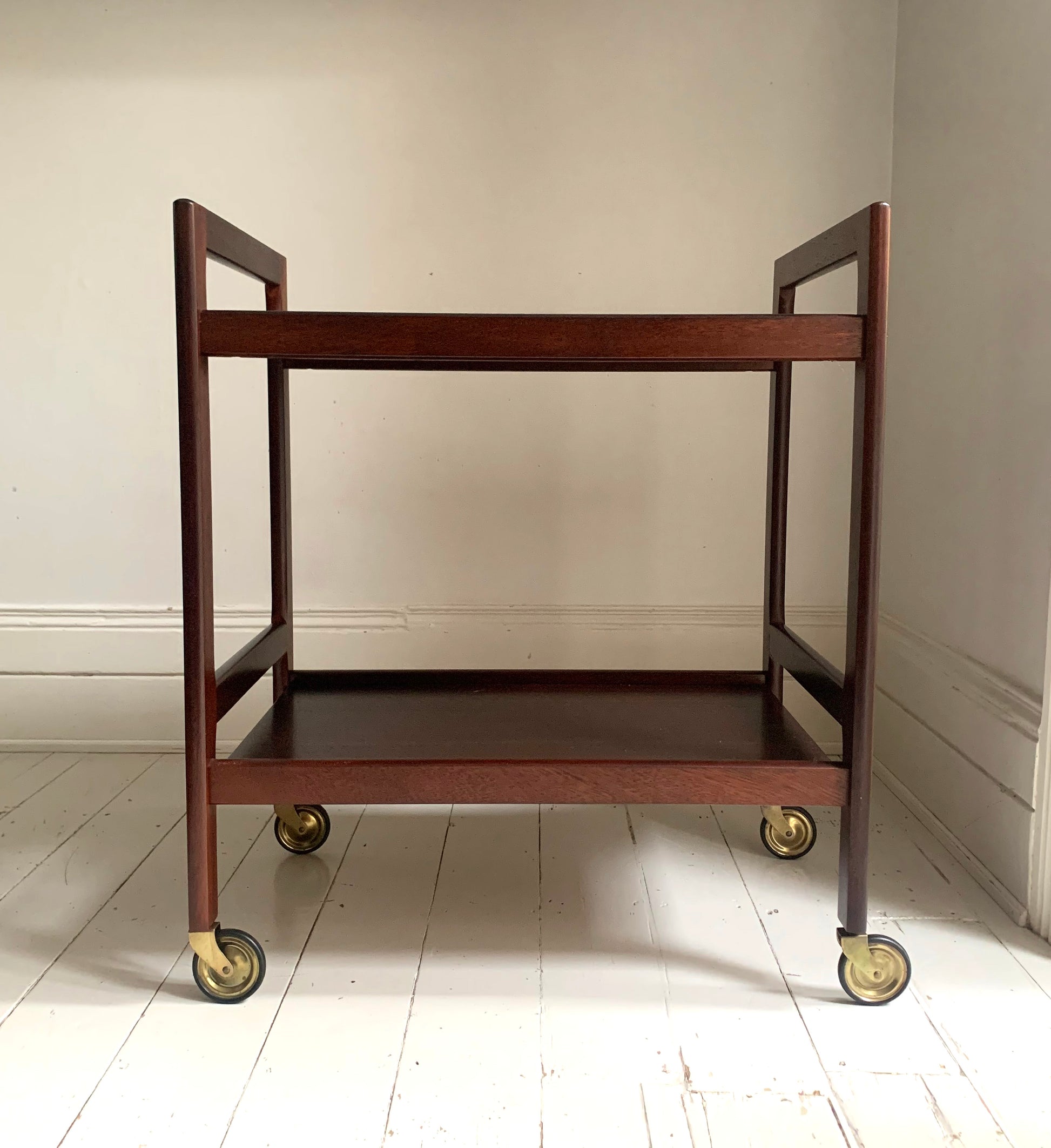 Vintage Mid Century Modern Dark Teak Drinks Trolley / Bar Cart With Brass Wheels