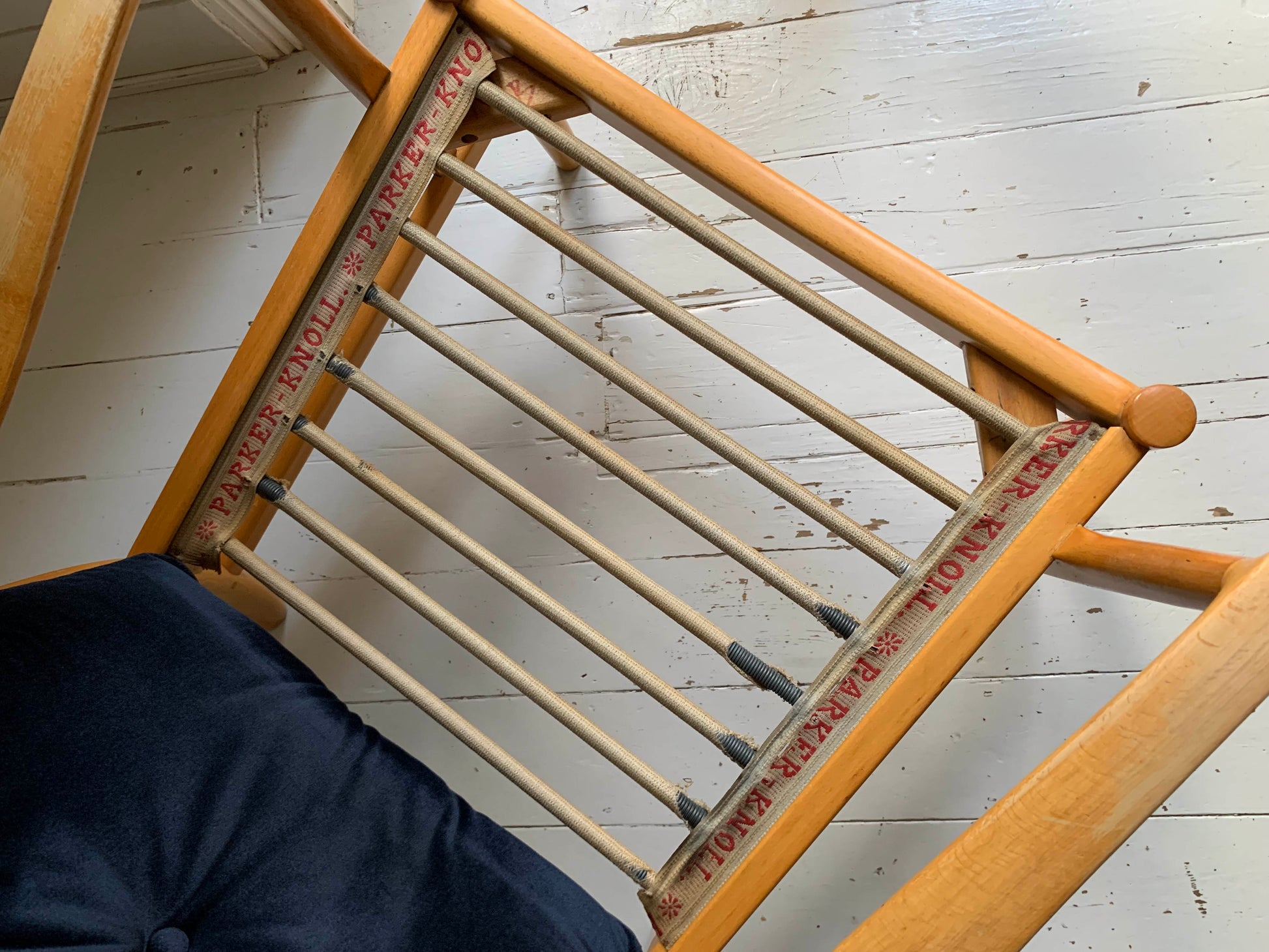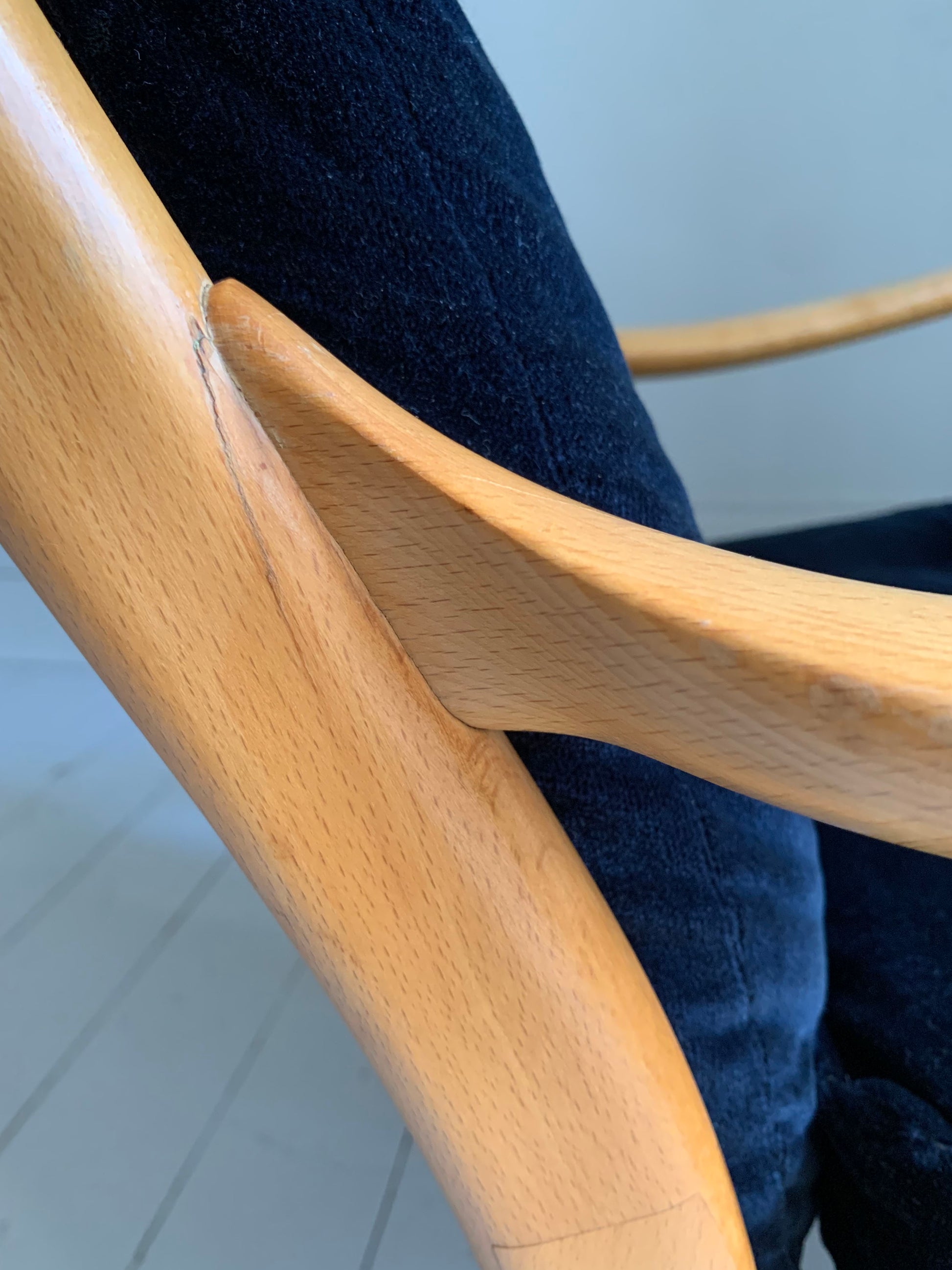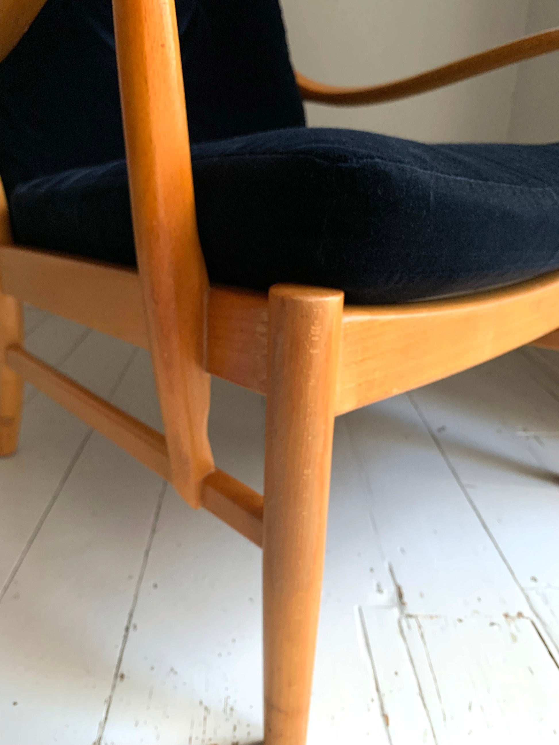 Please note on the beech frame there are a few knocks and bumps as to be expected with a vintage piece, there is also an historical fix at the arm joint - and a few areas where the original varnish has worn away.