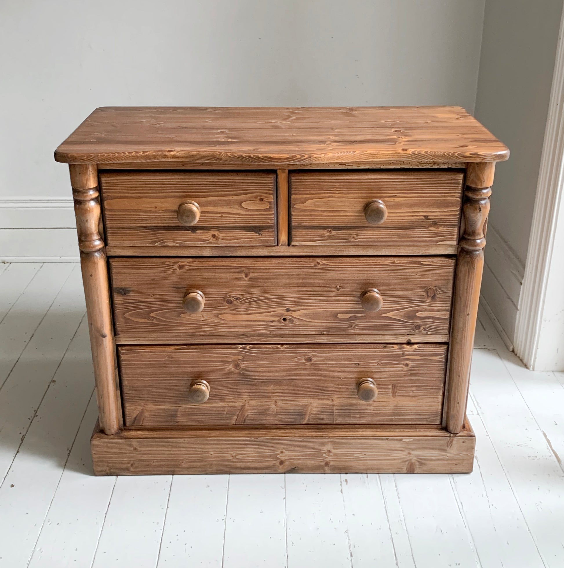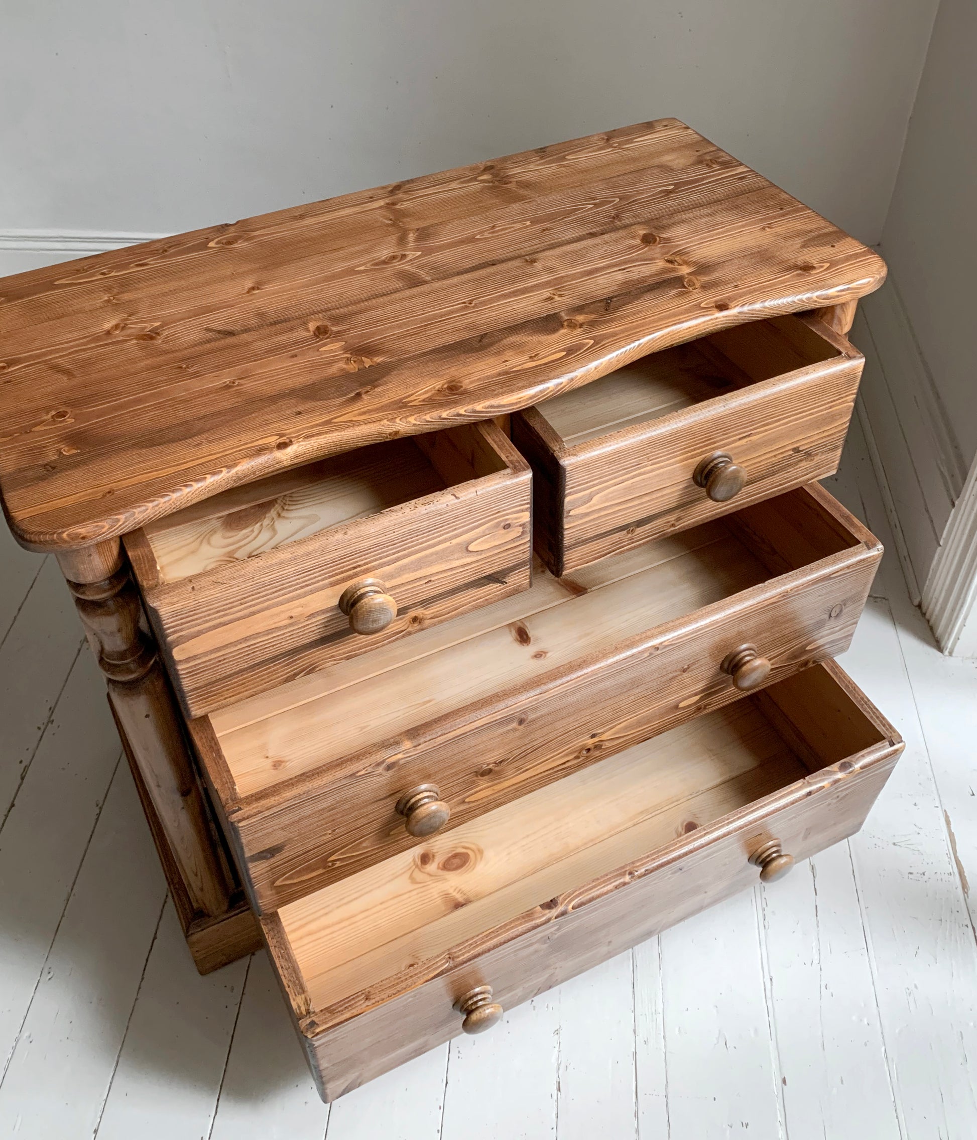 Vintage Pine Chest Of Drawers, 2 Over 2, Curved Top & Decorative Side Columns