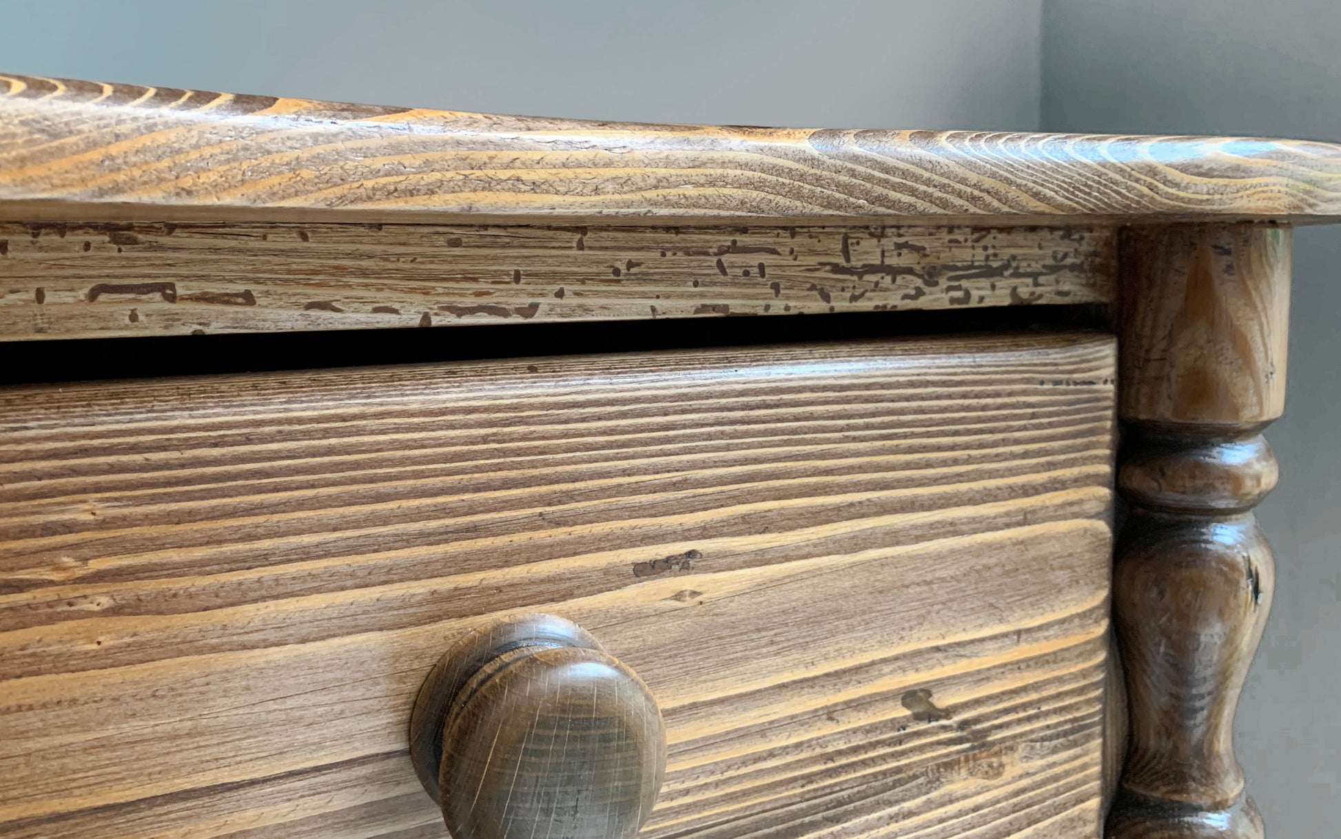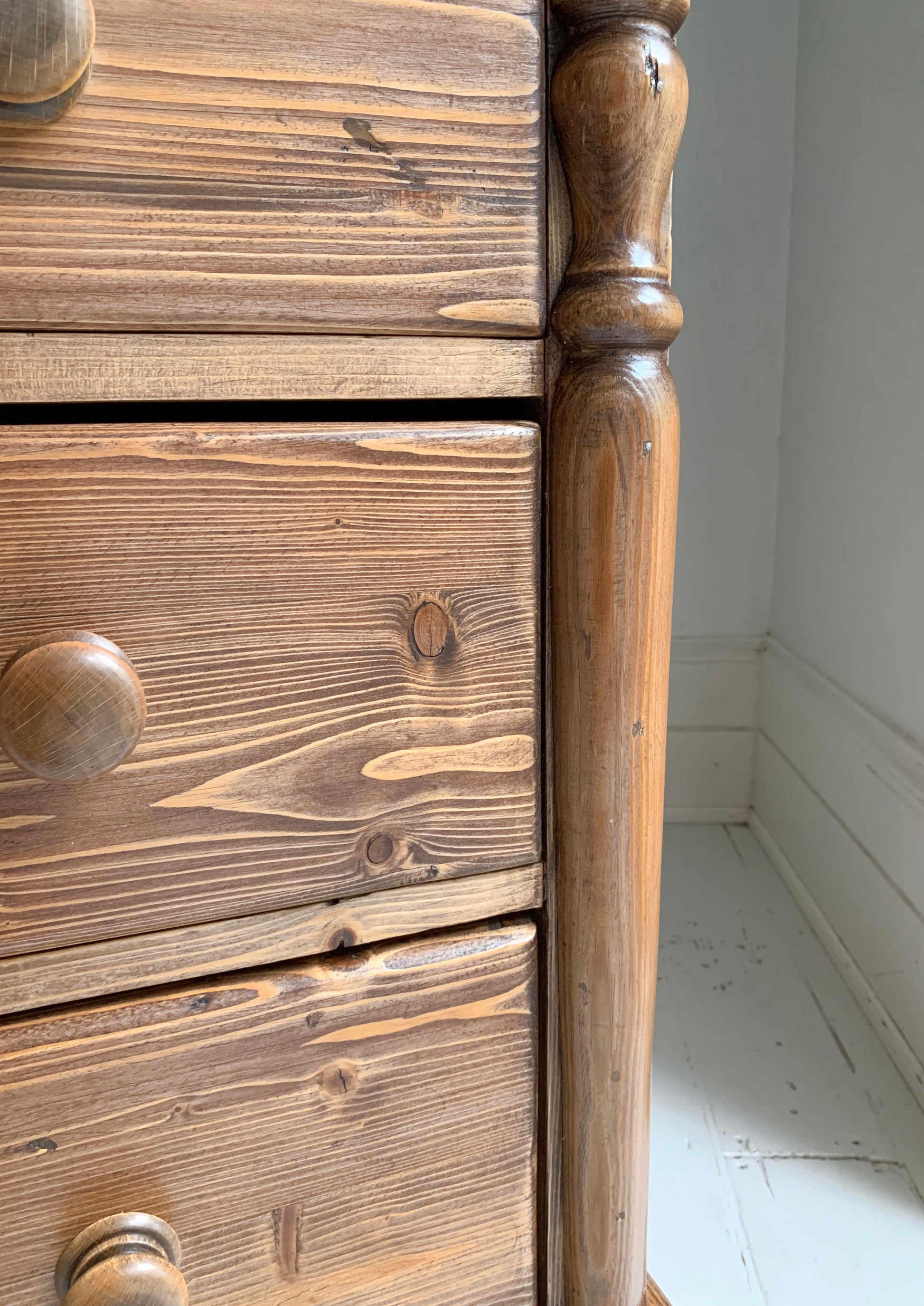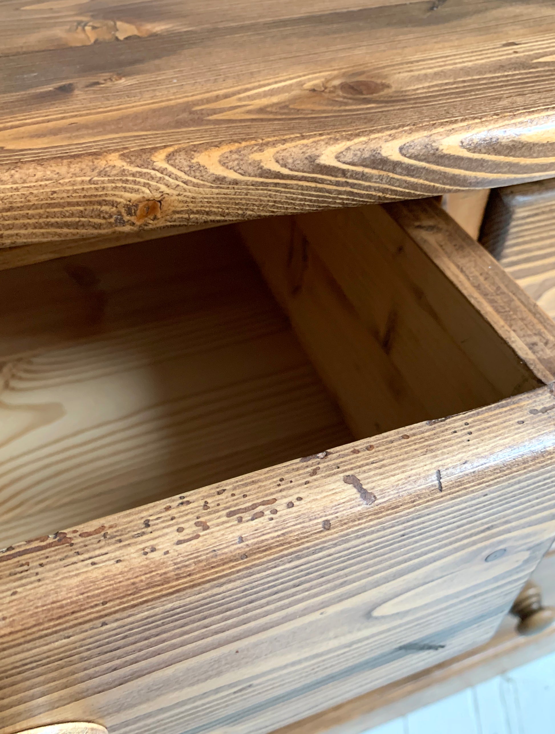 It's been deep cleaned, repaired and finished in a rich deep tone, sealed with Danish oil. Please note there are some signs of historical woodworm - particularly on the top left hand side as you look at the chest of drawers; we have treated it again twice to ensure its good to go. Any questions, of course, do ask.